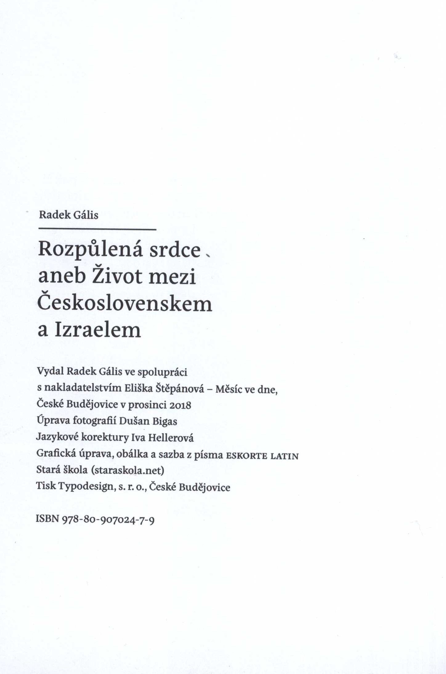 Title information Rozpůlená srdce, aneb, Život mezi Československem a Izraelem / Radek Gális ; úprava fotografií Dušan Bigas ; grafická úprava, obálka a sazba z písma Eskort latin Stará škola Personal name Gális, Radek, 1968- (Author) (Author of afterword, colophon, etc.) (Photographer) (Publisher) Další autoři Bigas, Dušan (Other) Pojar, Tomáš, 1973- (Author of introduction) Corporation Měsíc ve dne (nakladatelství) (Publisher) Typodesign (firma) (Printer) Stará škola (grafické studio) (Book designer) Publication České Budějovice : Radek Gális ve spolupráci s nakladatelstvím Eliška Štěpánová - Měsíc ve dne, 2018 Manufacture České Budějovice : Typodesign, s.r.o. Scope 169 stran : ilustrace (některé barevné), portréty, faksimile ; 19 cm + 1 pohlednice (12 x 16 cm) ISBN 978-80-907024-7-9 (Eliška Štěpánová - Měsíc ve dne ; brožováno) Country Czech Republic Language Czech Note Na přední straně obálky barevné foto (Jakov Rabin a Eta Schönhauserová), žlutý obdélník s černým textem; dvoubarevný text na hřbetu. - Na přední záložce seznam osobností z knihy, na zadní stručná biografie a bibliografie autora. - Černá vazba, žlutý text (i na hřbetu). - Frontispis. - Obsah. - Slovo úvodem od T. Pojara. - Motto V. Fischla. - Barevné portréty osobností, černý list s názvem textu a jménem osobnosti; na rubu černého listu citace osobnosti a komentář autora. - Rozhovory. - Černobílé, tónované a barevné fotografie, faksimile s popisky. - Slovo na závěr od autora. - Část textu úvodu T. Pojara na zadní straně obálky. - Přebal.