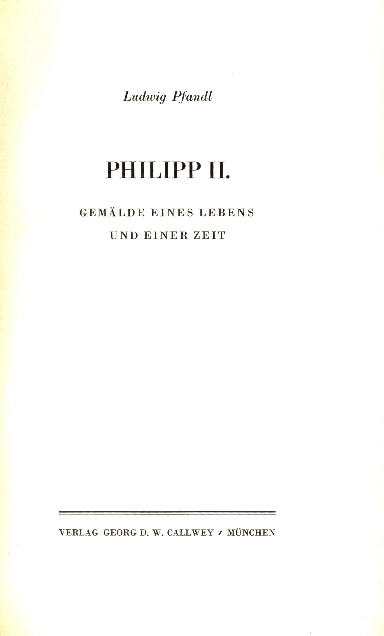 Title information Philipp II. : Gemälde eines Lebens und einer Zeit / Ludwig Pfandl Personal name Pfandl, Ludwig (Author) Další autoři Georg D. W. Callwey (München, Německo) (Publisher) Hofbuchdruckerei Kastner & Callwey (München, Německo) (Printer) Publication München : Verlag Georg D. W. Callwey, [1938] Manufacture Kastner & Callwey Copyright notice date ©1938 Scope 562 stran : ilustrace ; 23 cm ISBN (vázáno) Country Germany Language German Note Zdobená obálka. - Celoplátěná vazba. - Na přední záložce obálky anotace. - Frontispis. - Černobílé ilustrace. - Bibliografie. - Rodokmen.