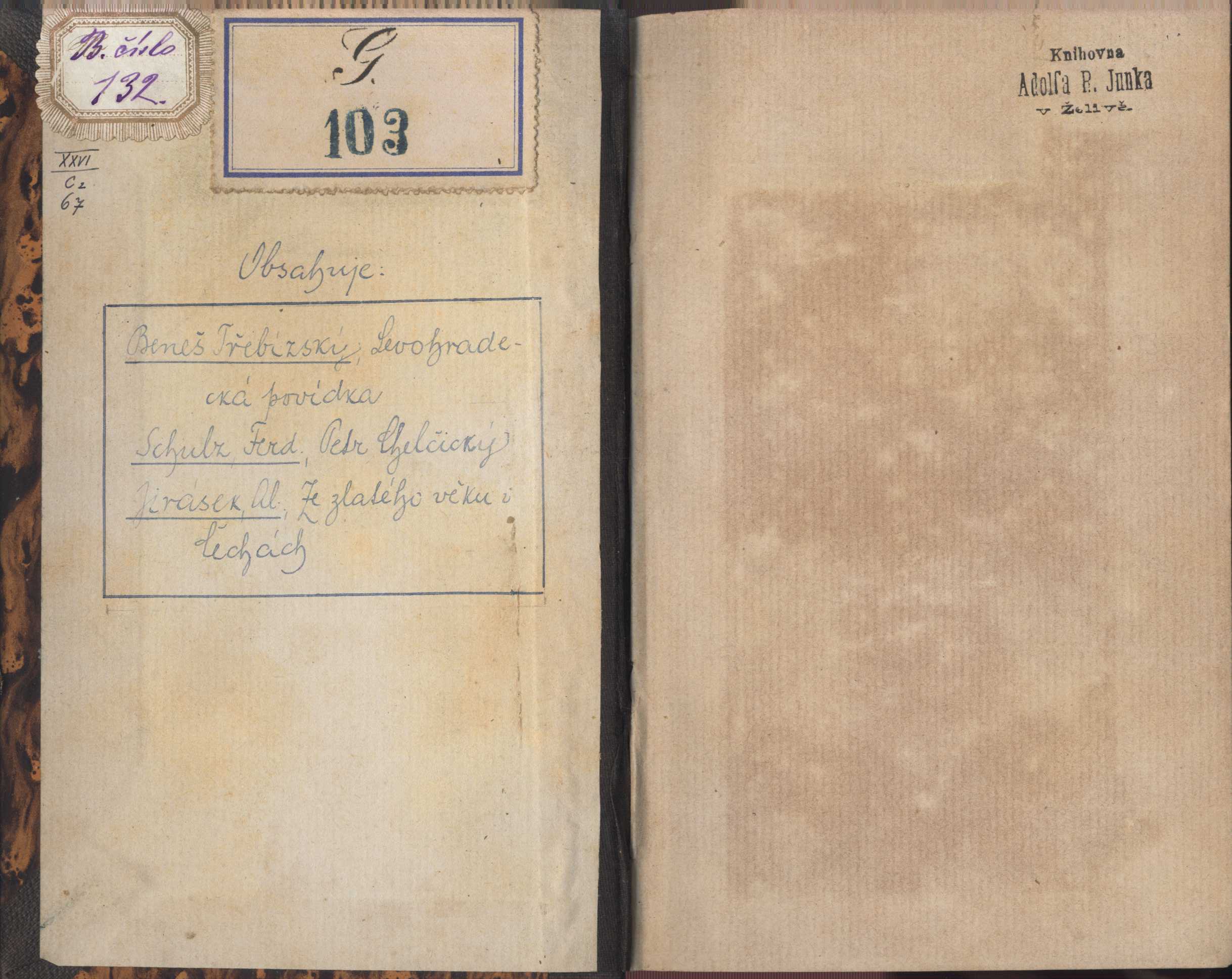 Document kind monografie Keywords česká literatura * česká próza * povídka * historická povídka * historické povídky * historická próza * historická tematika UDC 821.162.3 * 821.162.3-3 * 82-32 Bound in/Published with Petr Chelčický. Ze zlatého věku v Čechách Former owners Junek, Adolf R. Junek Adolf R. Uživatelské pole PNP Signatura KaG XXVI C2 67: Převazba, bez obálky. - Obsahuje přívazky: Ferdinand Schulz: Petr Chelčický; Alois Jirásek: Ze zlatého věku v Čechách. Signatura KaG XXVI C2 67: V knize razítka a signatury majitele Adolfa R. Junka v Žižkově. - Na předním přídeští rukopisný obsah svazku. Call number Track No. Location Info KaG XXVI C2 67 xxx/KAG Sbírka