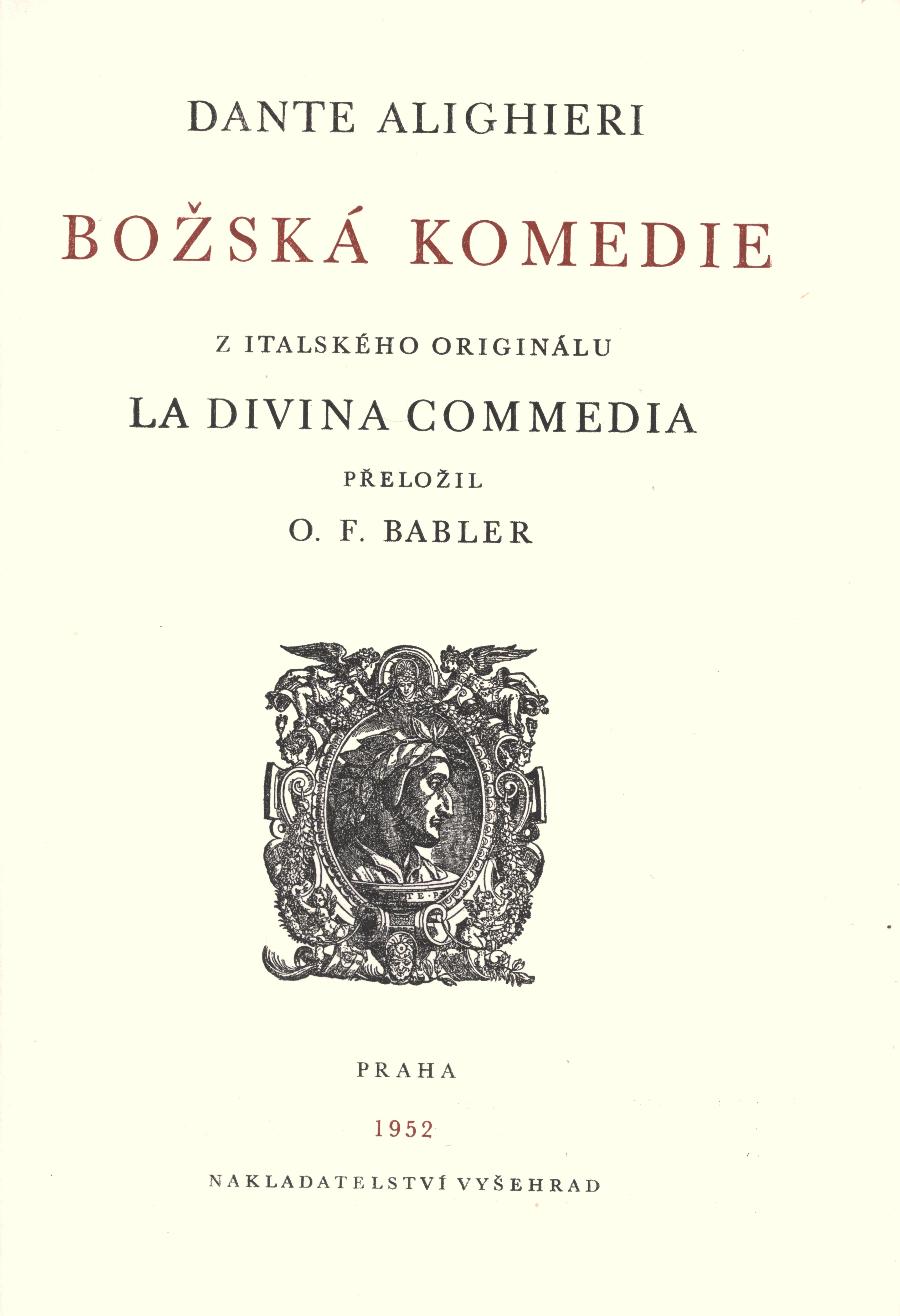 1. Title informationBožská komedie / Dante Alighieri ; z italského originálu... přeložil O. F. Babler ; [doslov K. N. Děržavina přeložil z ruského originálu ... Bohuslav Ilek ; iniciály nakreslil František Tichý ; obálku a vazbu navrhl a graficky za použití anonymních ilustrací italských z XV. století upravil Jiří Blažek]