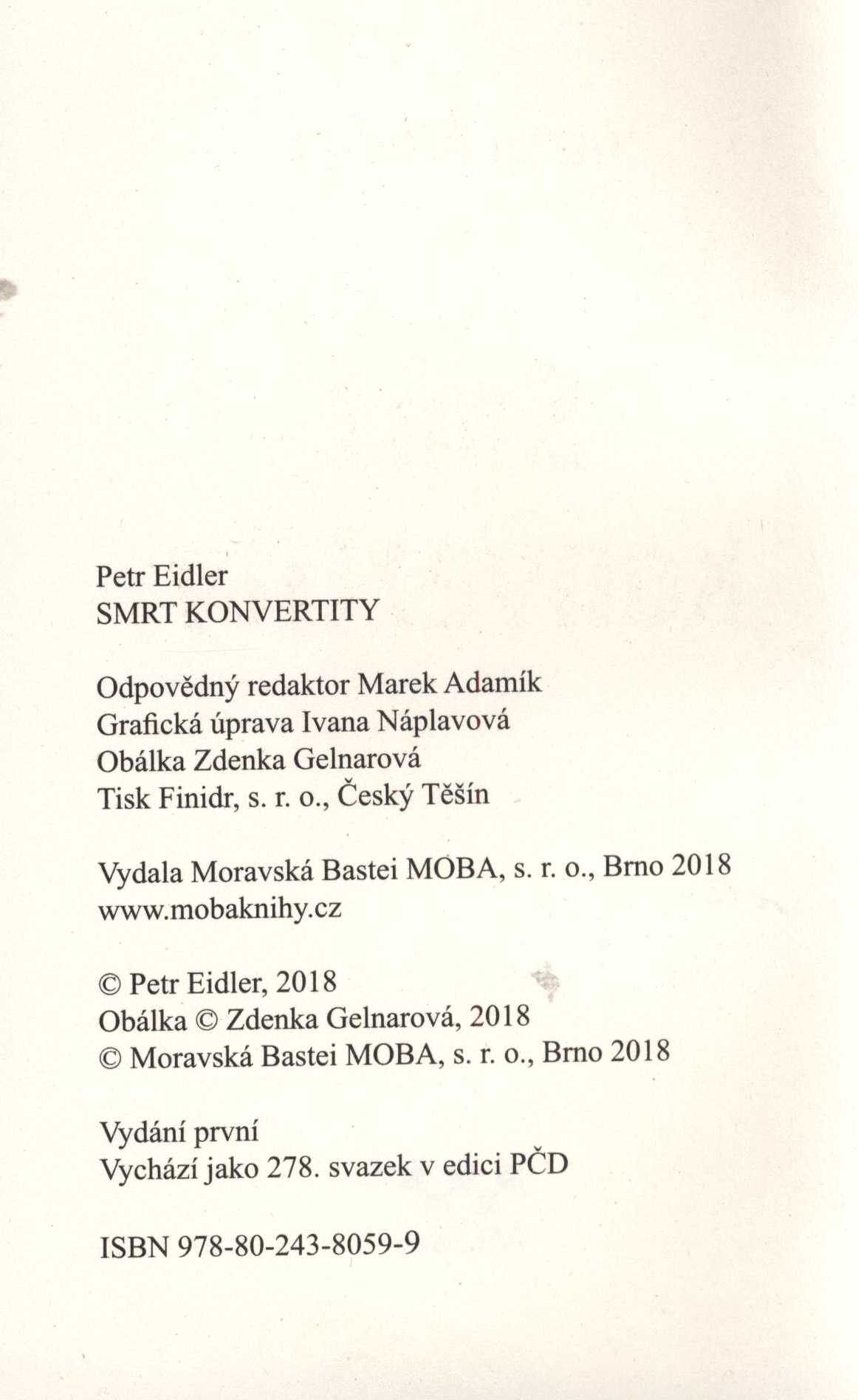 Title information Smrt konvertity / Petr Eidler ; grafická úprava Ivana Náplavová ; obálka Zdenka Gelnarová Personal name Eidler, Petr, 1958- (Author) Další autoři Náplavová, Ivana (Book designer) Gelnarová, Zdenka (Bookjacket designer) Corporation Moravská Bastei MOBA (nakladatelství) (Publisher) Finidr (tiskárna) (Printer) Edition statement Vydání první Publication Brno : MOBA, 2018 Manufacture Český Těšín : Finidr, s.r.o. Scope 285 stran ; 19 cm ISBN 978-80-243-8059-9 (vázáno) Edition Původní česká detektivka ; 278. svazek