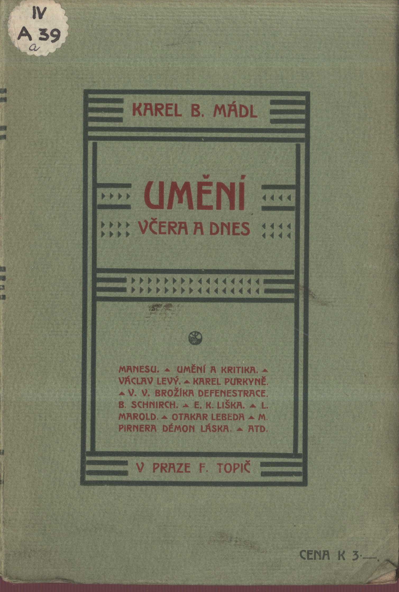 Názvové údaje Umění včera a dnes. [1] / Karel B. Mádl Osobní jméno Mádl, Karel Boromejský, 1859-1932 (Autor) Další autoři F. Topič (nakladatelství) (Nakladatel, vydavatel) Česká grafická akciová společnost Unie (v Praze) (Tiskař) Nakladatel V Praze : F. Topič, 1904 Výrobce V Praze : Česká akc. grafická společnost "Unie", 1904 Rozsah 274 stran ; 19,3 cm ISBN (brožováno) Země vyd. Česko Jazyk dok. čeština Poznámky Barevná zdobená obálka, resp. celoplátěná zdobená vazba. - Červený a černý tisk titulního listu. - Předmluva. - Na rubu zadní strany obálky nakladatelská reklama.