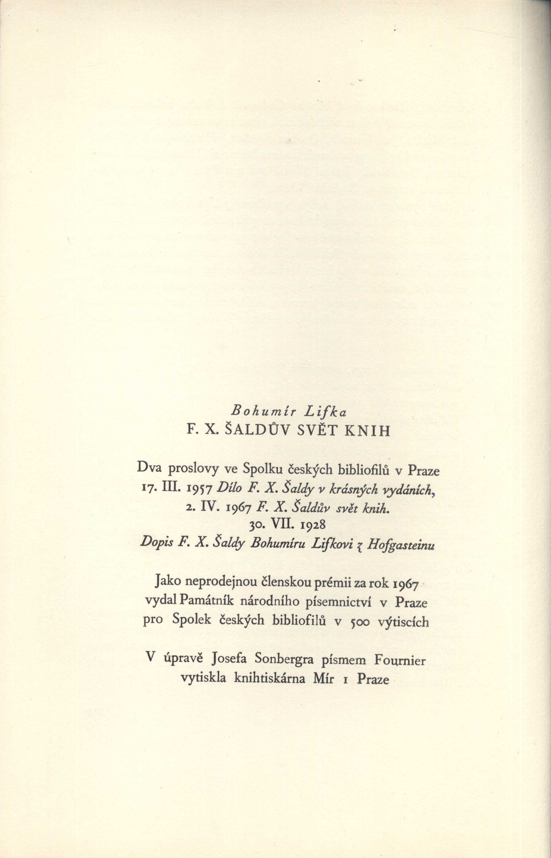 1. Title informationF.X. Šaldův svět knih : dva proslovy ve Spolku českých bibliofilů 17. III. 1957 a 2. IV. 1967 v Praze : faksimile dopisu F.X. Šaldy Bohumíru Lifkovi z Hofgasteinu 30. VII. 1928 / Bohumír Lifka