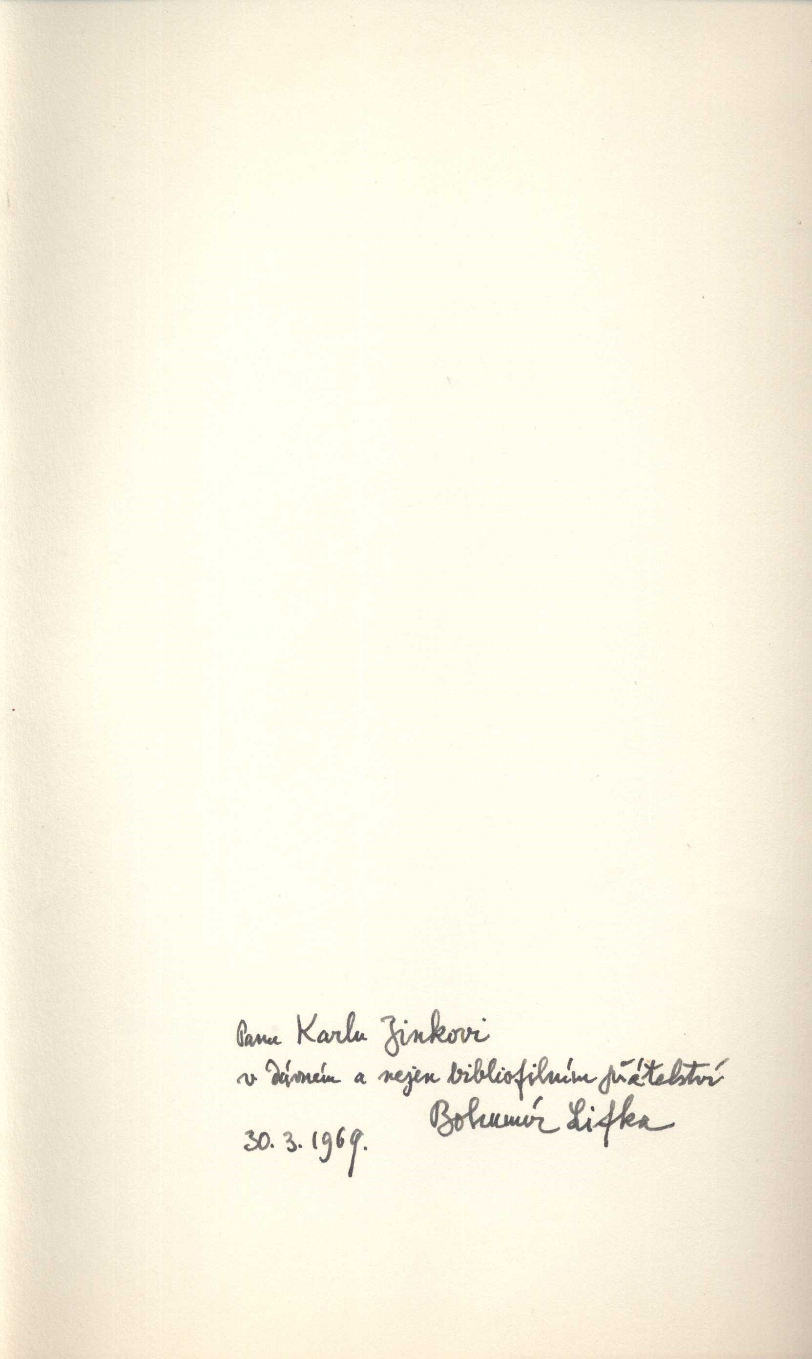 U sign. VZinková 0769 na 2. vakátu vepsaná dedikace autora (perem): "Panu Karlu Zinkovi v dávném a nejen bibliofilním přátelství Bohumír Lifka. 30. 3. 1969."