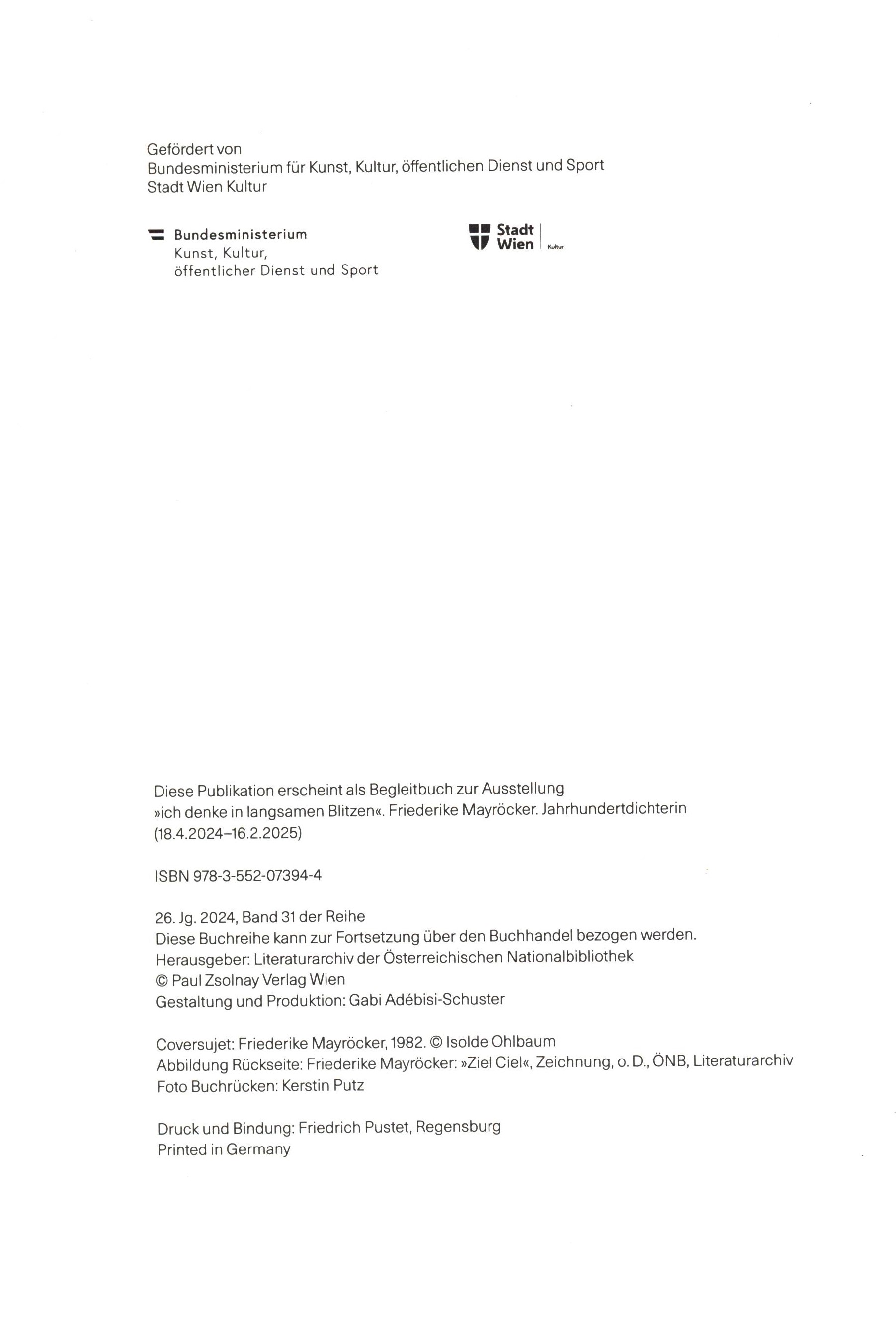 Profile. Buchreihe des Literaturarchivs der Österreichischen Nationalbibliothek, (Paul Zsolnay Verlag)Country Austria Language German Note Zdobená obálka s portrétem umělkyně. - Doprovodná publikace k výstavě konané 18.4.2024-16.2.2025 ve Vídni u příležitosti stého výročí narození Friederike Mayröcker. - Na zadní straně obálky informace o její pozůstalosti. - Seznam vyobrazení. - Sborník příspěvků. - Medailonky autorů