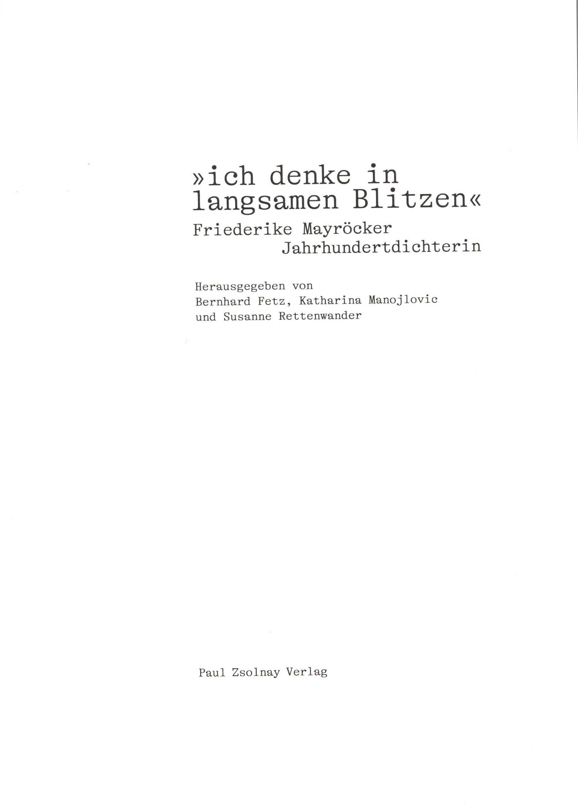 Title information "ich denke in langsamen Blitzen" : Friederike Mayröcker Jahrhundertdichterin / herausgegeben von Bernhard Fetz, Katharina Manojlovic, und Susanne Rettenwander Další autoři Fetz, Bernhard, 1963- (Editor) Manojlovic, Katharina, 1980- (Editor) Rettenwander, Susanne, 1992 (Editor) Corporation Paul Zsolnay Verlag (Publisher) Friedrich Pustet Graphischer Großbetrieb (Regensburg, Německo) (Printer) Publication Wien : Paul Zsolnay Verlag, [2024] Manufacture Regensburg : Friedrich Pustet Scope 349 stran : ilustrace, portréty, fotografie, reprodukce ; 24 cm ISBN (Vázáno) Edition Profile. Buchreihe des Literaturarchivs der Österreichischen Nationalbibliothek, (Paul Zsolnay Verlag) ; Band 31 der Reihe