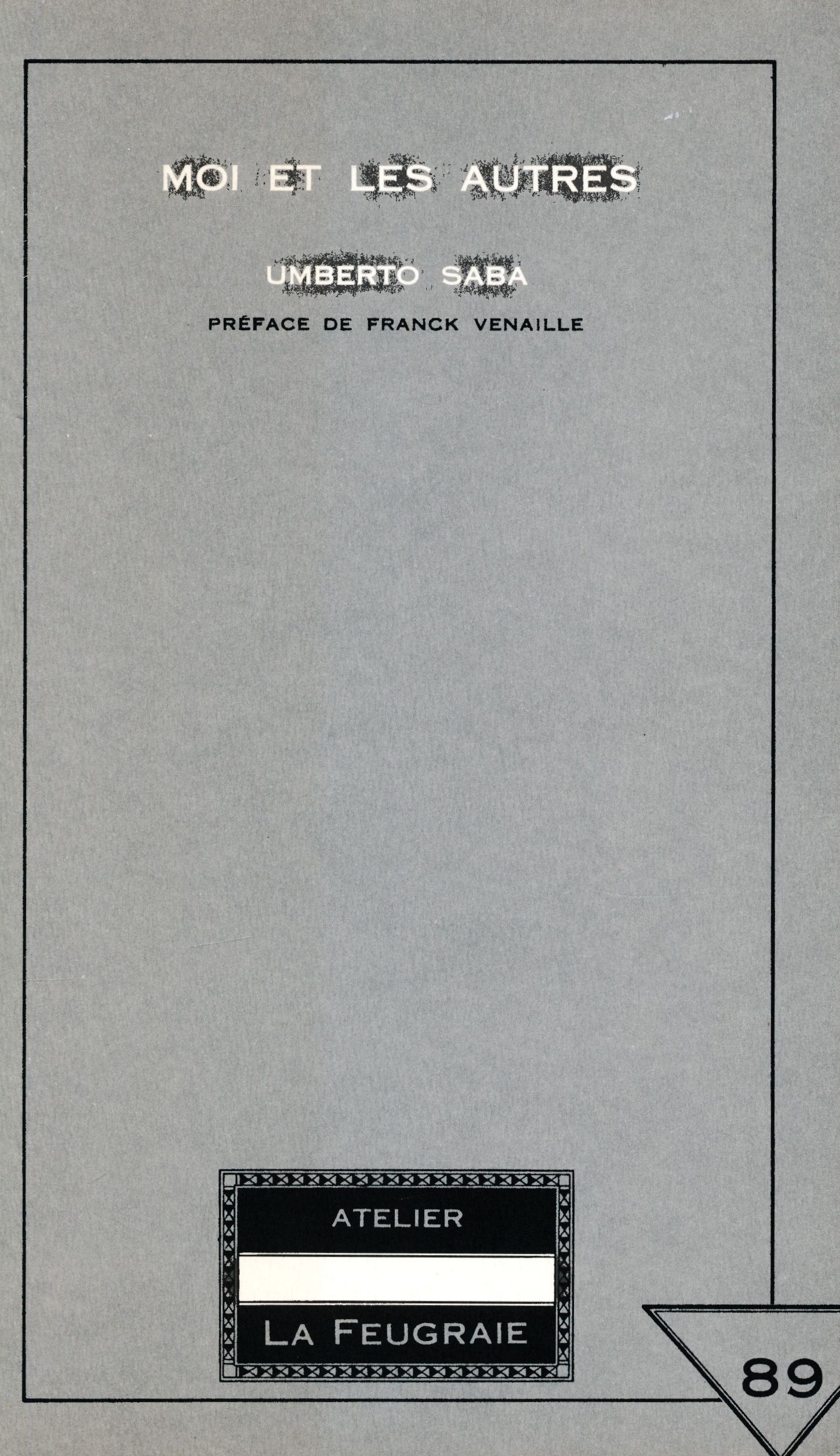 - Title information - Moi et les autres / Umberto Saba ; traduit par Marie-Claire Taroni et Michel Maire - Personal name - Saba, Umberto, 1883-1957 (Author) - Další autoři - Venaille, Franck, 1936-2018 (Author of introduction) - Corporation - Atelier La Feugraie (firma) (Publisher) - Publication - Saint-Pierre-la-Vieille : Atelier La Feugraie, 1989 - Scope - 131 stran ; 22 cm - ISBN - 2-905408-11-1 (vázáno) - Edition - L'Allure du chemin (Domaine Étranger) ; 89