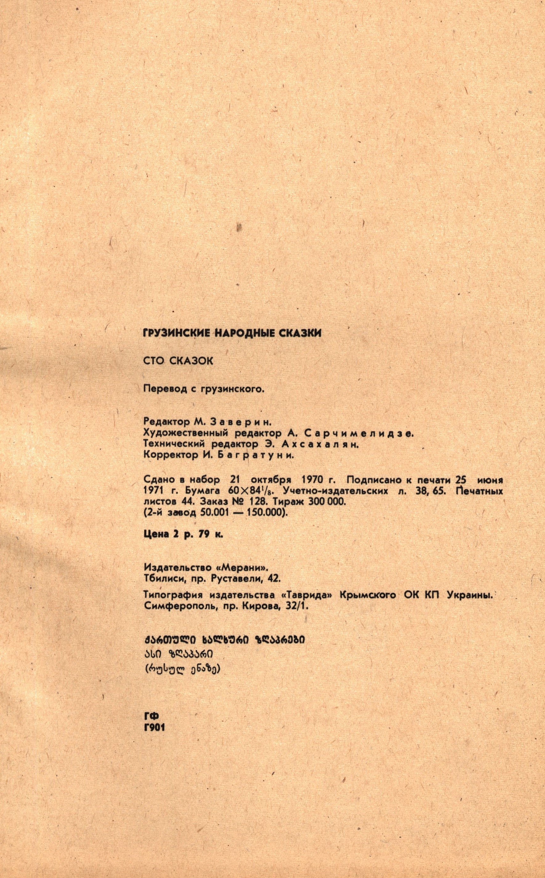 Title information Gruzinskije narodnyje skazki : sto skazok / sbornik sostavlen i pereveden N.I. Dolidze ; pod redakcijej M. Ja. Čikovani Další autoři Dolidze, N. I. (Translator) (Compiler) Čikovani, M. Ja. (Redactor) Corporation Gamomcʻemloba "Merani" (Publisher) Publication Tbilisi : Izdatel'stvo: Merani, 1971 Manufacture Simferopol : Tavrida Scope 350 stran : ilustrace ; 29 cm ISBN (vázáno) Country Russia (Federation) Language Russian Language of the original Georgian Note Barevná zdobená obálka. - Zdobený frontispice a titulní list. - Černobílé ilustrace. - Ztučnělé iniciály. - Obsah. - Tiráž.
