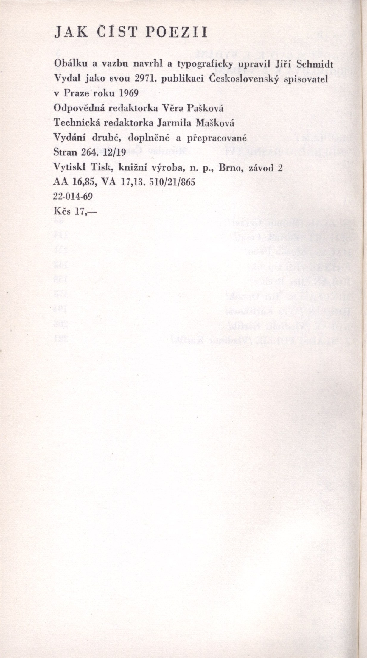Názvové údaje Jak číst poezii / autorský kolektiv Jiří Brabec ... [et al.] ; redigoval Jiří Opelík ; [obálku a vazbu navrhl a typograficky upravil Jiří Schmidt] Osobní jméno Brabec, Jiří, 1929- (Autor) Další autoři Opelík, Jiří, 1930-2024 (Editor) Schmidt, Jiří, 1921-1992 (Autor obálky) (Výtvarník vazby) (Typograf) (Knižní grafik) Korp. Československý spisovatel (nakladatelství) (Nakladatel, vydavatel) Tisk Brno (tiskárna) (Tiskař) Údaje o vydání Vydání druhé, doplněné a přepracované Nakladatel Praha : Československý spisovatel, 1969 Výrobce Tisk, knižní výroba, n. p.) Rozsah 261, [3] s. ; 19,6 cm ISBN (váz.) Země vyd. Česko Jazyk dok. čeština Poznámky Další autoři komentářů: Mojmír Grygar, Zdeněk Pešat, Jiří Opelík, Věra Karfíková, Vladimír Karfík. -- Na zál. přebalu pozn. o knize. -- Úvodní slovo k 1. vyd., předmluva k 2. vyd.