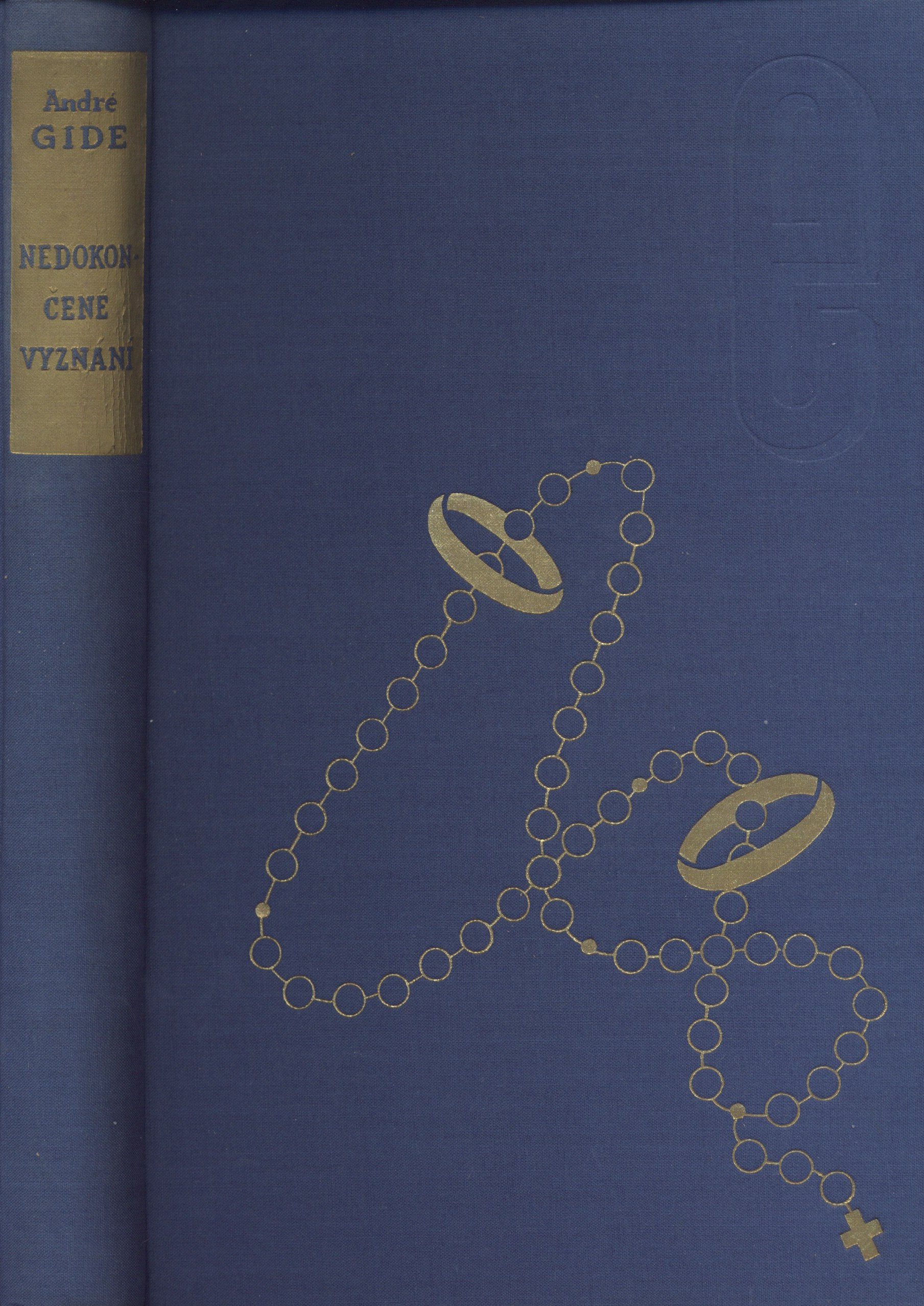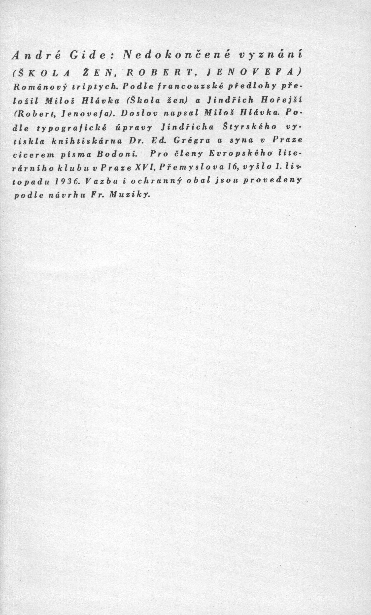 Tiráž: "André Gide: Nedokončené vyznání (Škola žen, Robert, Jenovefa). Románový triptych. Podle francouzské předlohy přeložil Miloš Hlávka (Škola žen) a Jindřich Hořejší (Robert, Jenovefa). Doslov napsal Miloš Hlávka. Podle typografické úpravy Jindřicha Štyrského vytiskla knihtiskárna Dr. Ed. Grégra a syna v Praze cicerem písma Bodoni. Pro členy Evropského literárního klubu v Praze XVI, Přemyslova 16, vyšlo 1. listopadu 1936. Vazba i ochranný obal jsou provedeny podle návrhu Fr. Muziky."