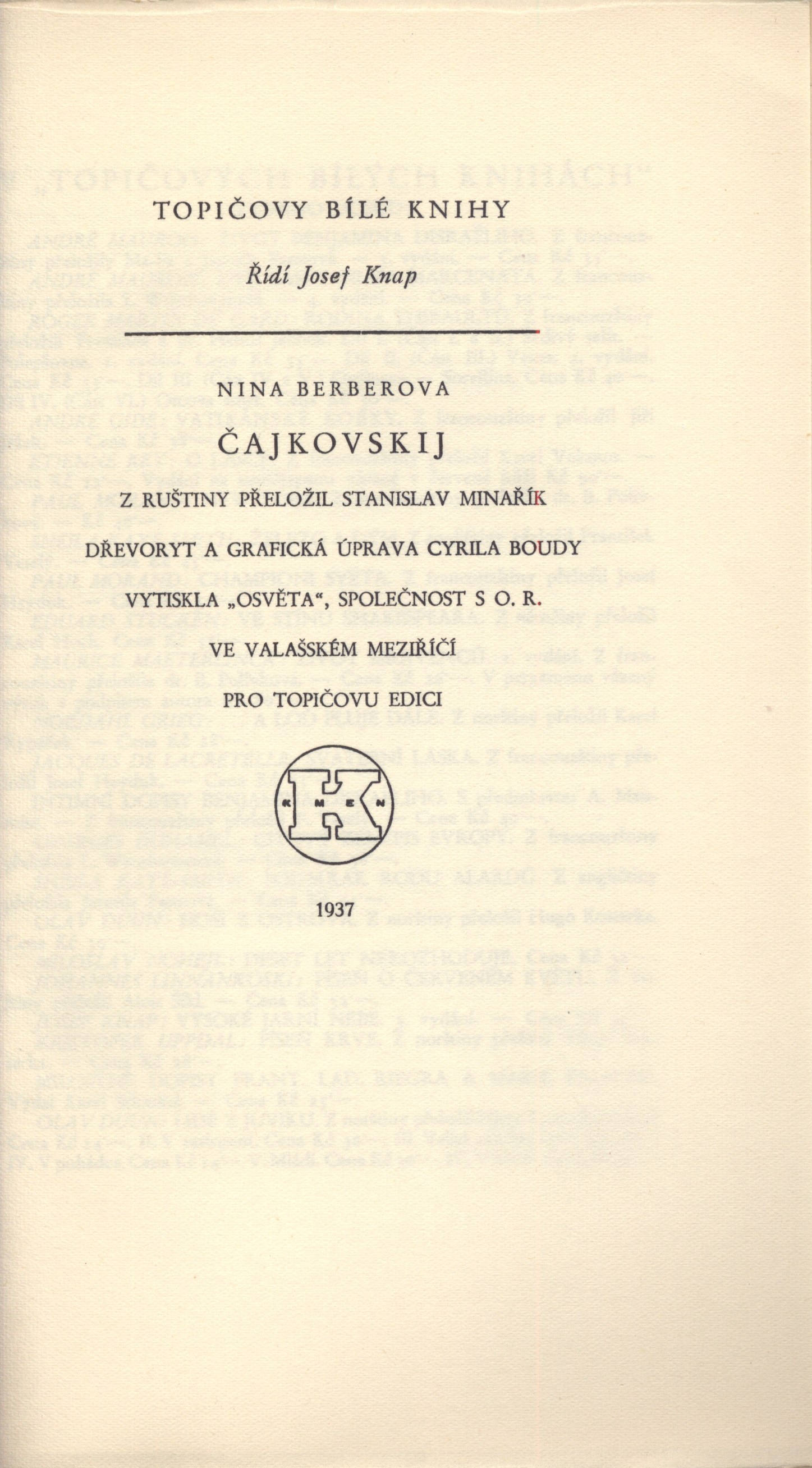 Title information Čajkovskij / Nina Berberova ; z ruštiny přeložil Stanislav Minařík ; [dřevoryt a grafická úprava Cyrila Boudy] Personal name Berberova, Nina Nikolajevna, 1901-1993 (Author) Další autoři Minařík, Stanislav, 1884-1944 (Translator) Bouda, Cyril, 1901-1984 (Illustrator) (Book designer) Corporation Topičova edice (nakladatelství) (Publisher) Osvěta (tiskárna) (Printer) Publication V Praze : Topičova edice, 1937 Manufacture Osvěta, společnost s o. r.) Scope 261 s. : il. ; 23 cm ISBN brož. Edition Topičovy Bílé knihy / řídí Josef Knap