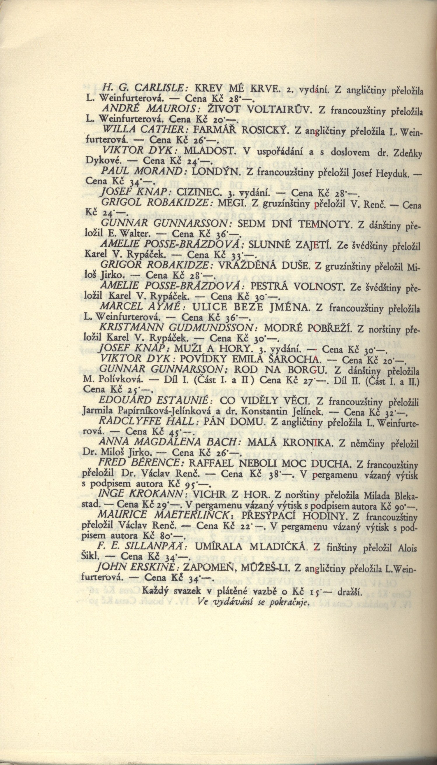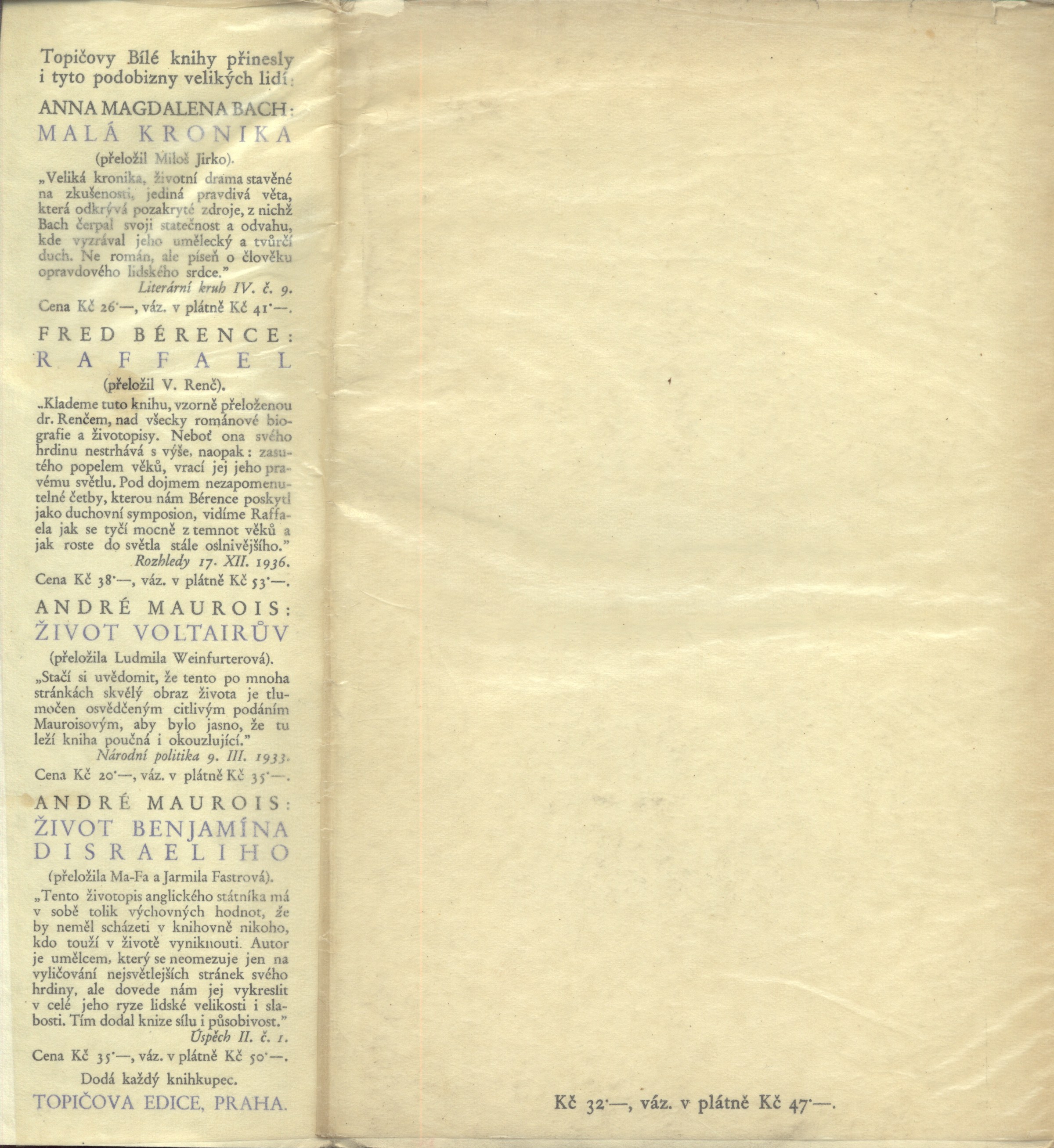 Topičovy Bílé knihy (Topičova edice)Country Czech Republic Language Czech Language of the original Russian Note Obálka s ilustrací. - Na záložkách upoutávky. - Dvoubarevný titulní list s ilustrací. - Edice nad tiráží, značka Kmene. - Seznam edice.