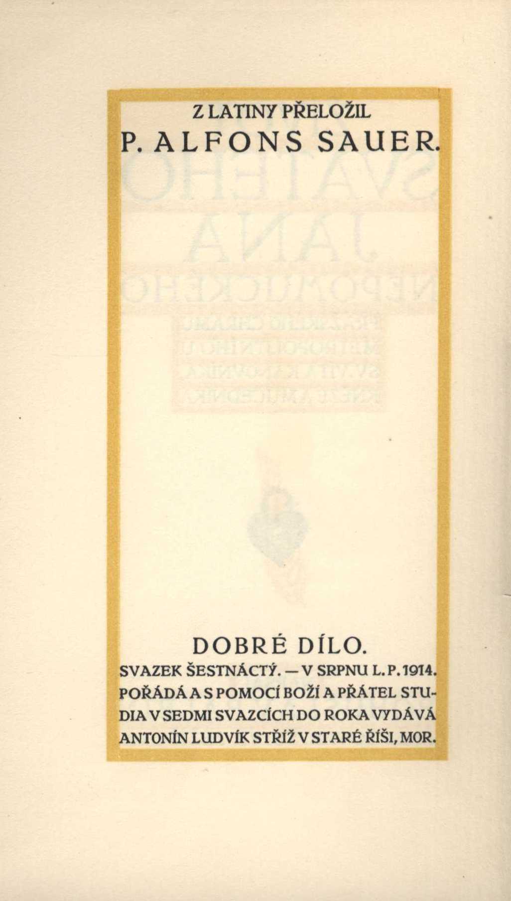 Title information Život svatého Jana Nepomuckého : pražského chrámu metropolitního u sv. Víta kanovníka, kněze a mučedníka / napsal Bohuslav Balbín ; [z latiny přeložil P. Alfons Sauer, překlad této knížky dokončil Antonín Ludvík Stříž ; vyzdobil ji Karel Schwetz] Personal name Balbín, Bohuslav, 1621-1688 (Author) Další autoři Sauer, Alfons, 1860-1911 (Translator) Stříž, Antonín Ludvík, 1888-1960 (Translator) (Publisher) Schwetz, Karel, 1888-1965 (Illustrator) Corporation Kryl a Scotti (firma) (Printer) Publication V Staré Říši na Moravě : Antonín Ludvík Stříž, 1914 Manufacture Kryl a Scotti) Scope 79 s. ; 8° ISBN brož. Edition Dobré dílo sv. 16