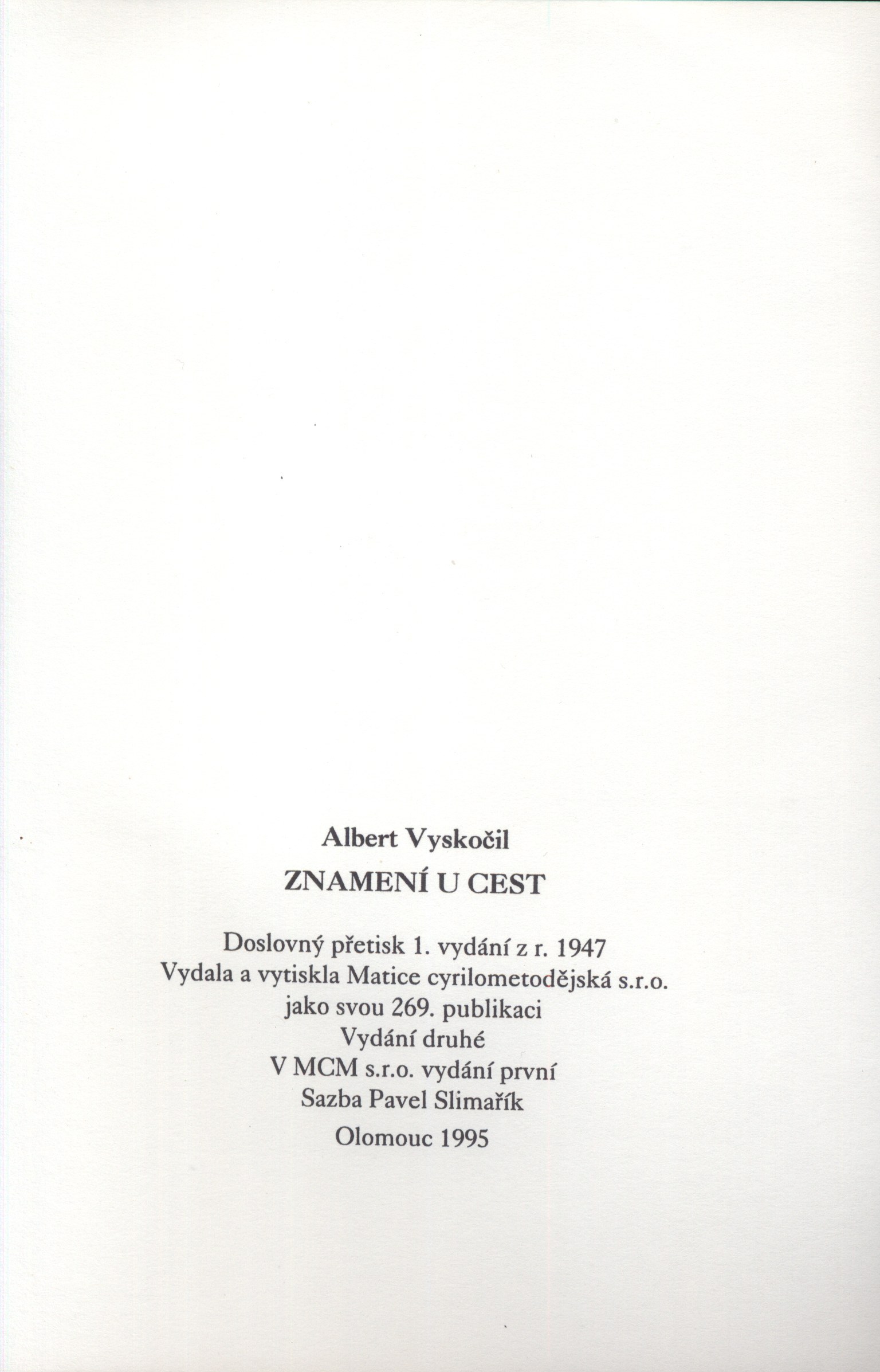 Title information Znamení u cest : kritické studie / Albert Vyskočil Personal name Vyskočil, Albert, 1890-1966 (Author) Další autoři Matice cyrilometodějská (nakladatelství : 1993-) (Publisher) (Printer) Další var.názvy Kritické studie Edition statement Vydání druhé, v MCM s.r.o. vydání první Publication Olomouc : Matice cyrilometodějská s.r.o., 1995 Scope 197 stran ; 21 cm ISBN (Brožováno) Country Czech Republic Language Czech Note Doslovný přetisk 1. vydání z r. 1947.