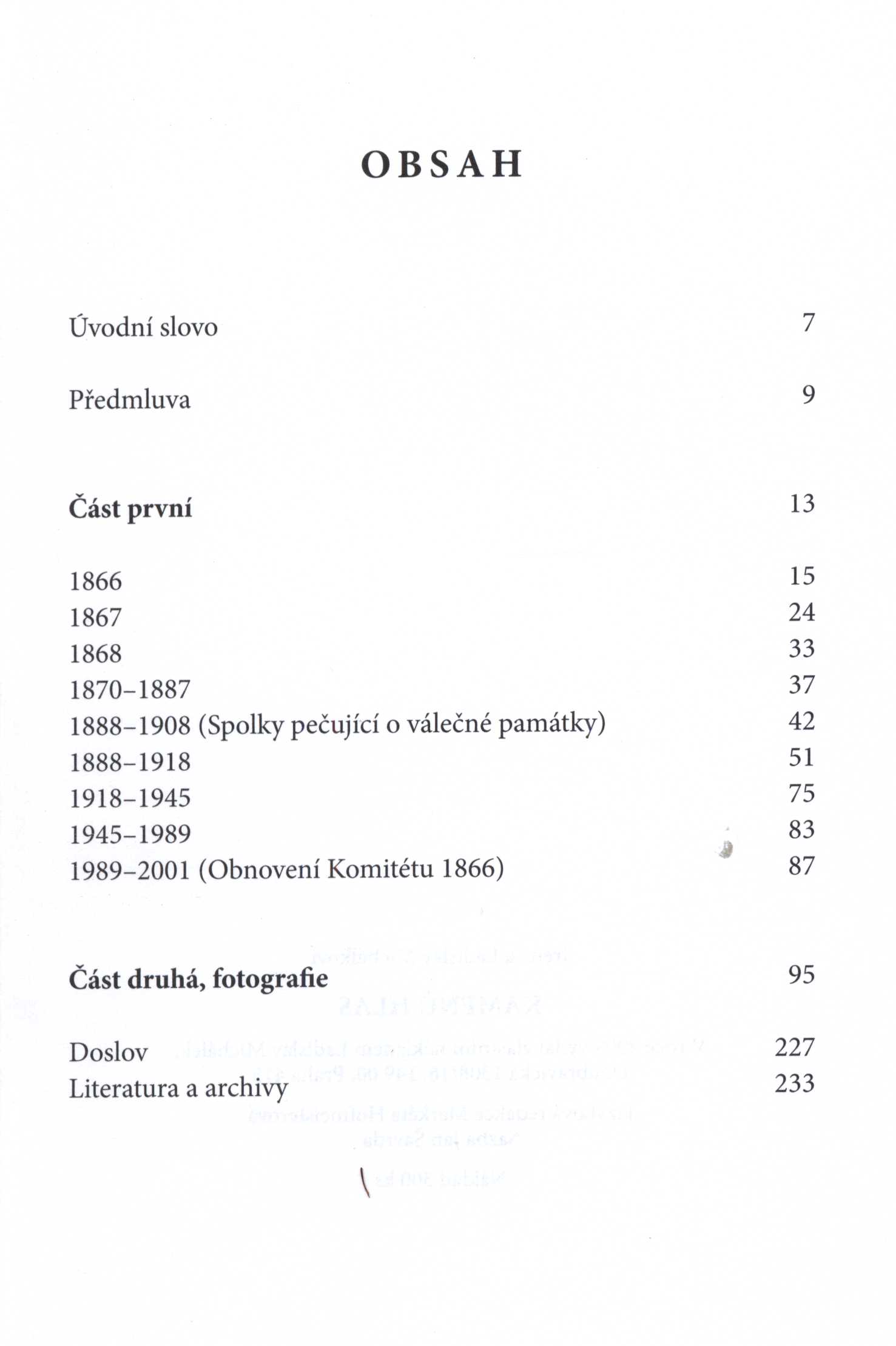 Annotation Monografie věnovaná souboru památek, které připomínají vojáky padlé v prusko-rakouské válce roku 1866 na různých místech severovýchodních Čech. Úvodní, chronologicky uspořádaná část mapuje výstavbu pomníků obětem války roku 1866, zároveň sleduje vznik a činnost spolků, které se věnovaly (a dodnes věnují) péči a ochraně těchto funerálních památek. Druhá část představuje ve fotografiích a stručných doprovodných textech jednotlivé pomníčky, kříže, památníky a drobné stavby spjaté s rokem 1866. Document kind monografie Keywords prusko-rakouská válka * r. 1866 * vojenské hřbitovy * vojenské hroby * vojenské památníky * sakrální stavby * funerální architektura * Česko * fotografické publikace * přehledy UDC 726 * 94(431+436)"1866" * 718:355 * 726.82:355 * 725.945 * 726.8 * (437.3) * (048.8) * (084.12) Uživatelské pole PNP Sign. C12b 18440 - Na titulním listu věnování Ládi Michálka Petrovi a Světlaně Kotykovým s datací (2011). Call number Track No. Location Info C12b 18440 2127/2018 Fond