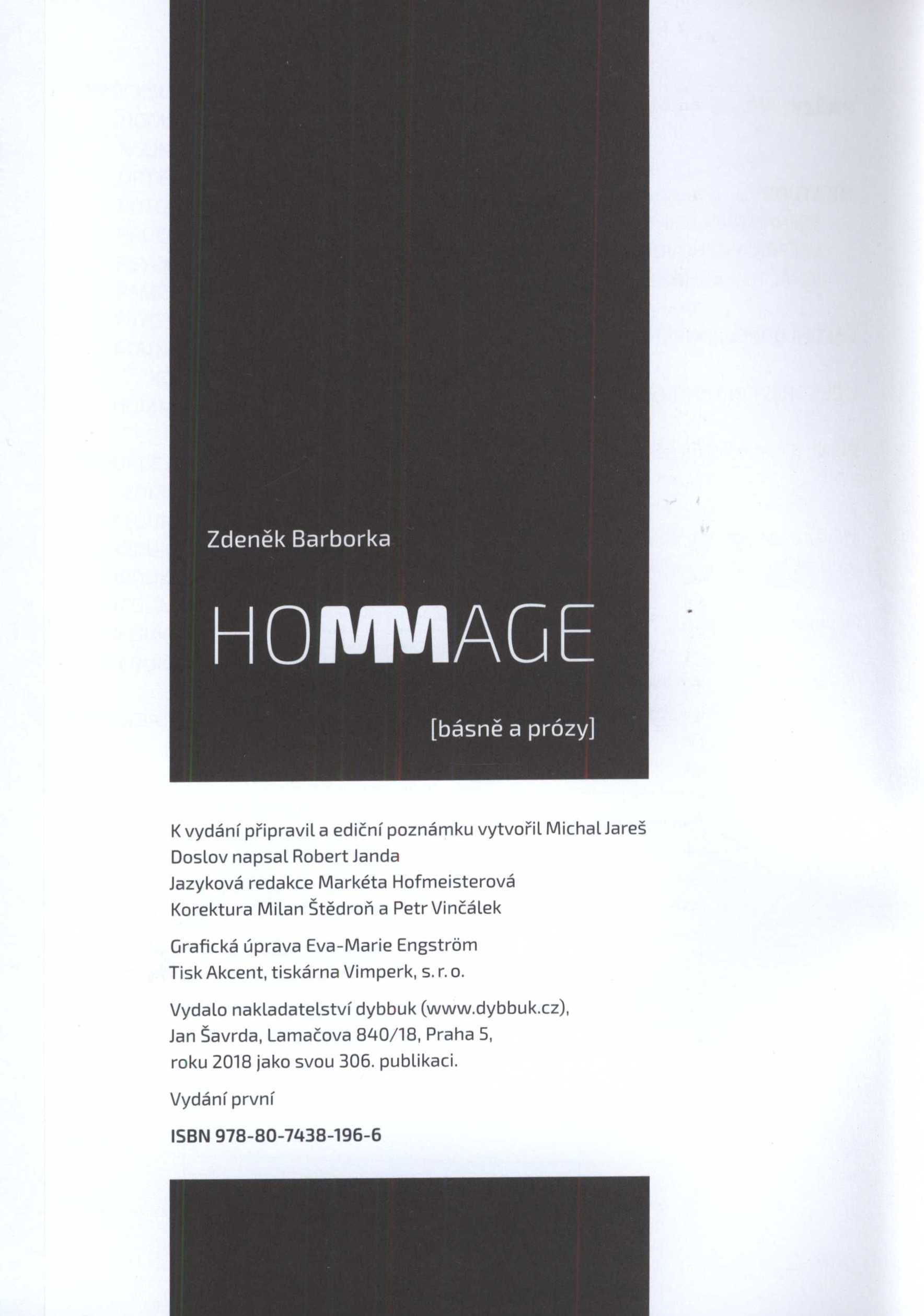 Title information Hommage : [básně a prózy] / Zdeněk Barborka ; k vydání připravil a ediční poznámku vytvořil Michal Jareš ; doslov napsal Robert Janda ; grafická úprava Eva-Marie Engström Personal name Barborka, Zdeněk, 1938-1994 (Author) Další autoři Jareš, Michal, 1973- (Editor) (Author of introduction) Janda, Robert, 1966- (Author of afterword, colophon, etc.) Engström, Eva-Marie (Book designer) Corporation Dybbuk (nakladatelství) (Publisher) Akcent tiskárna Vimperk (Printer) Edition statement Vydání první Publication Praha : Dybbuk, 2018 Manufacture Akcent, tiskárna Vimperk, s.r.o. Scope 594 stran : ilustrace ; 24 cm ISBN 978-80-7438-196-6 (vázáno) Country Czech Republic Language Czech Note Typografická obálka. - Frontispis. - Titulní list. - Na zadní straně obálky anotace.