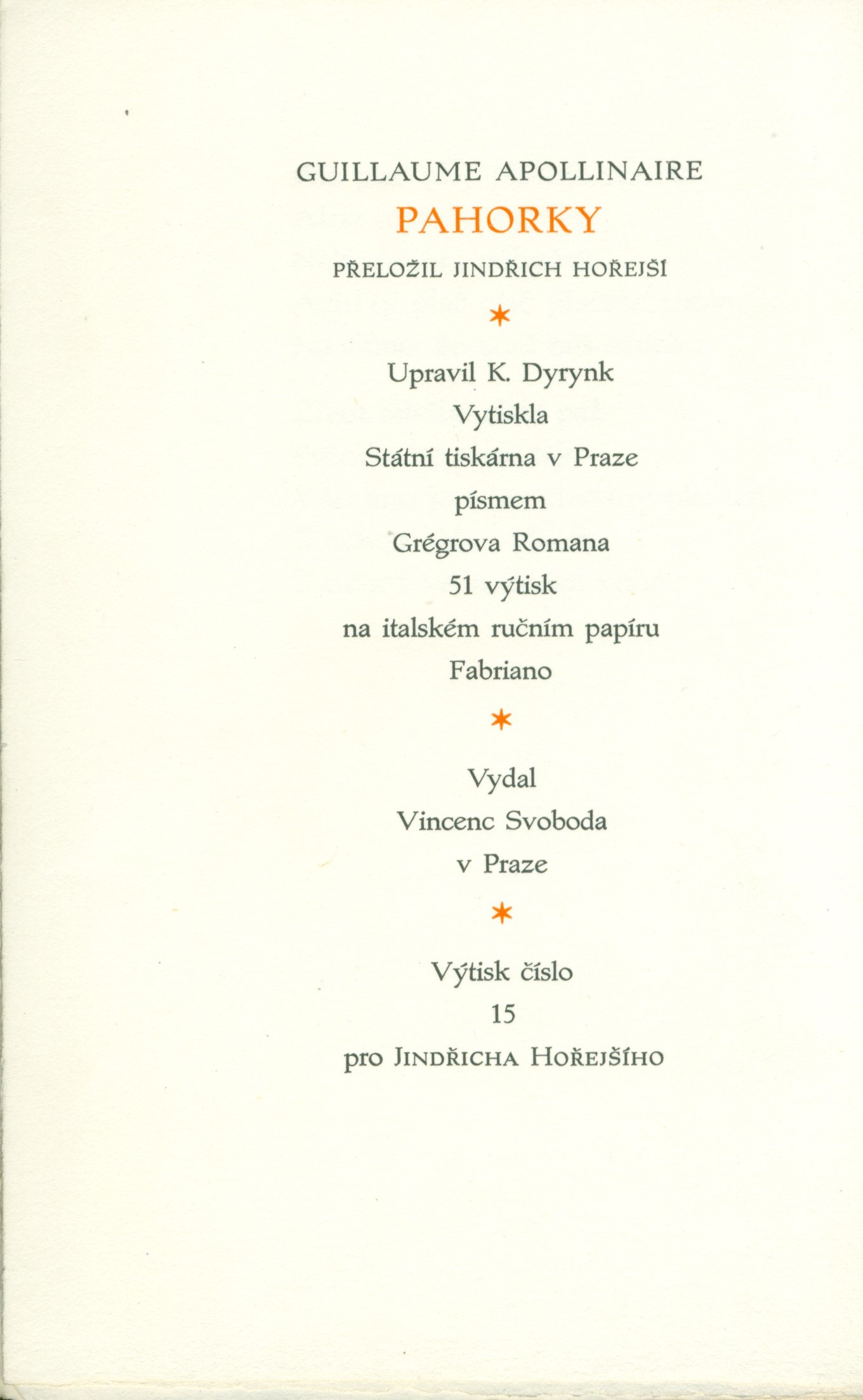 Keywords francouzská literatura * poezie * Apollinaire G. * francouzská poezie * český překlad * Hořejší J. * číslovaný výtisk * bibliofilie * r. 1931