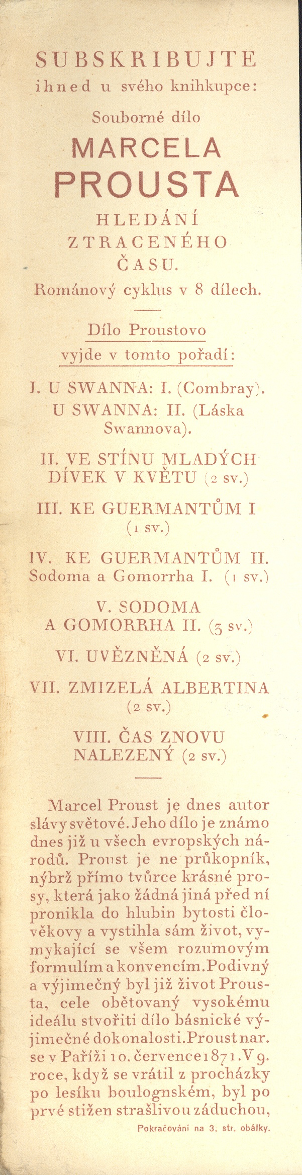 Note Zdobená obálka. - Na záložkách upoutávky. - Nakladatelská značka na vakátě. - Dvoubarevný titulní list. - Tiráž. - Na zadní straně obálky ediční upoutávky.