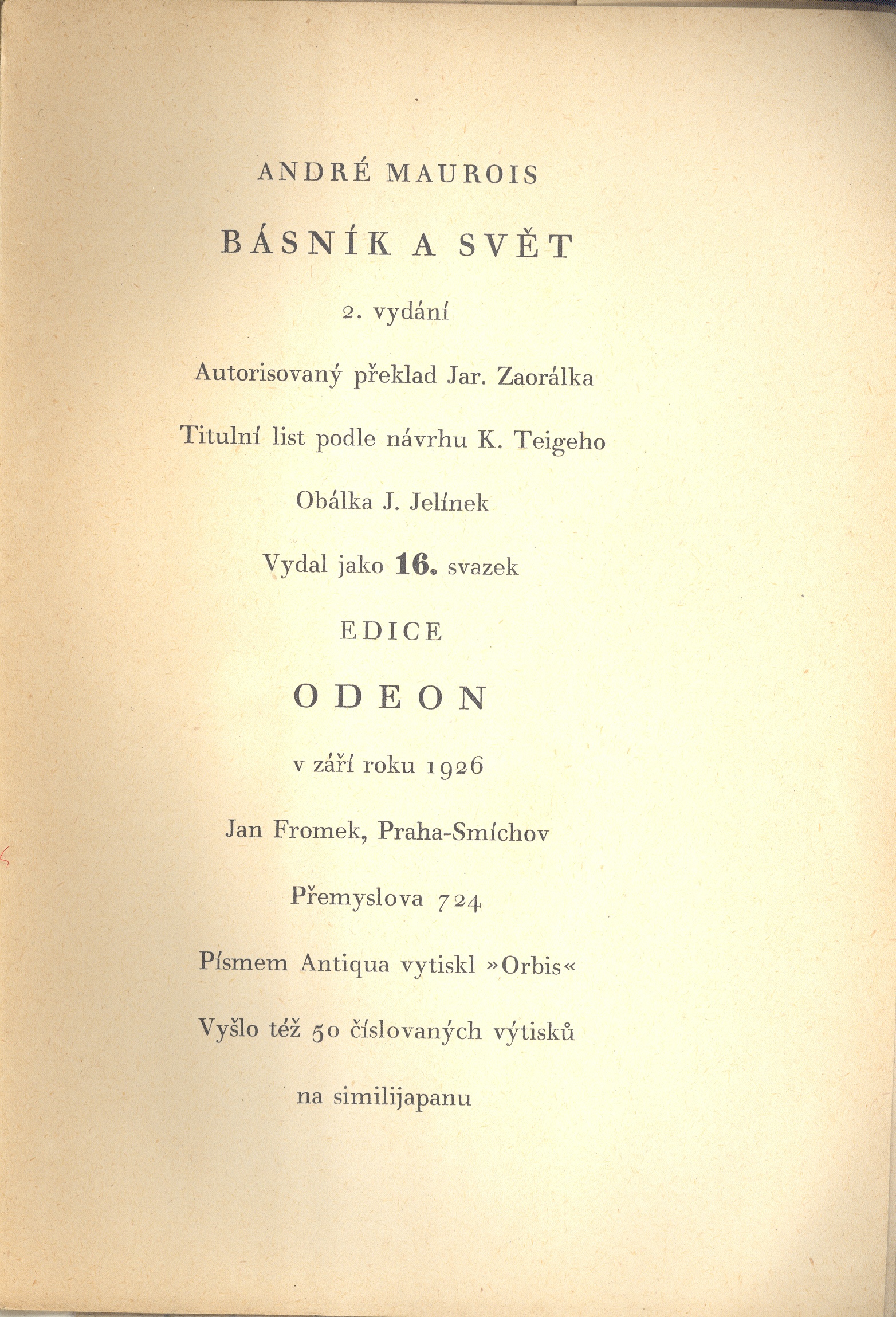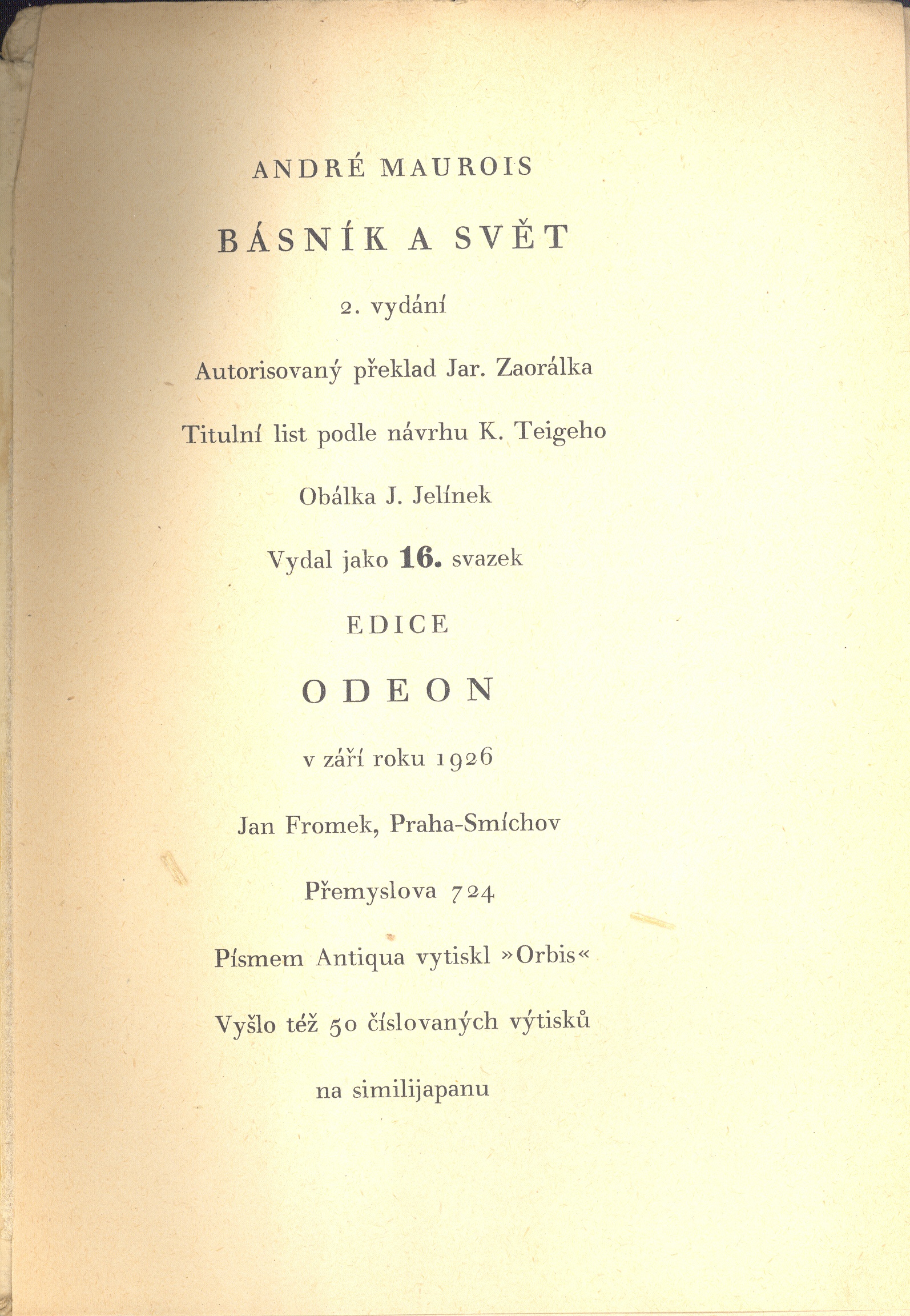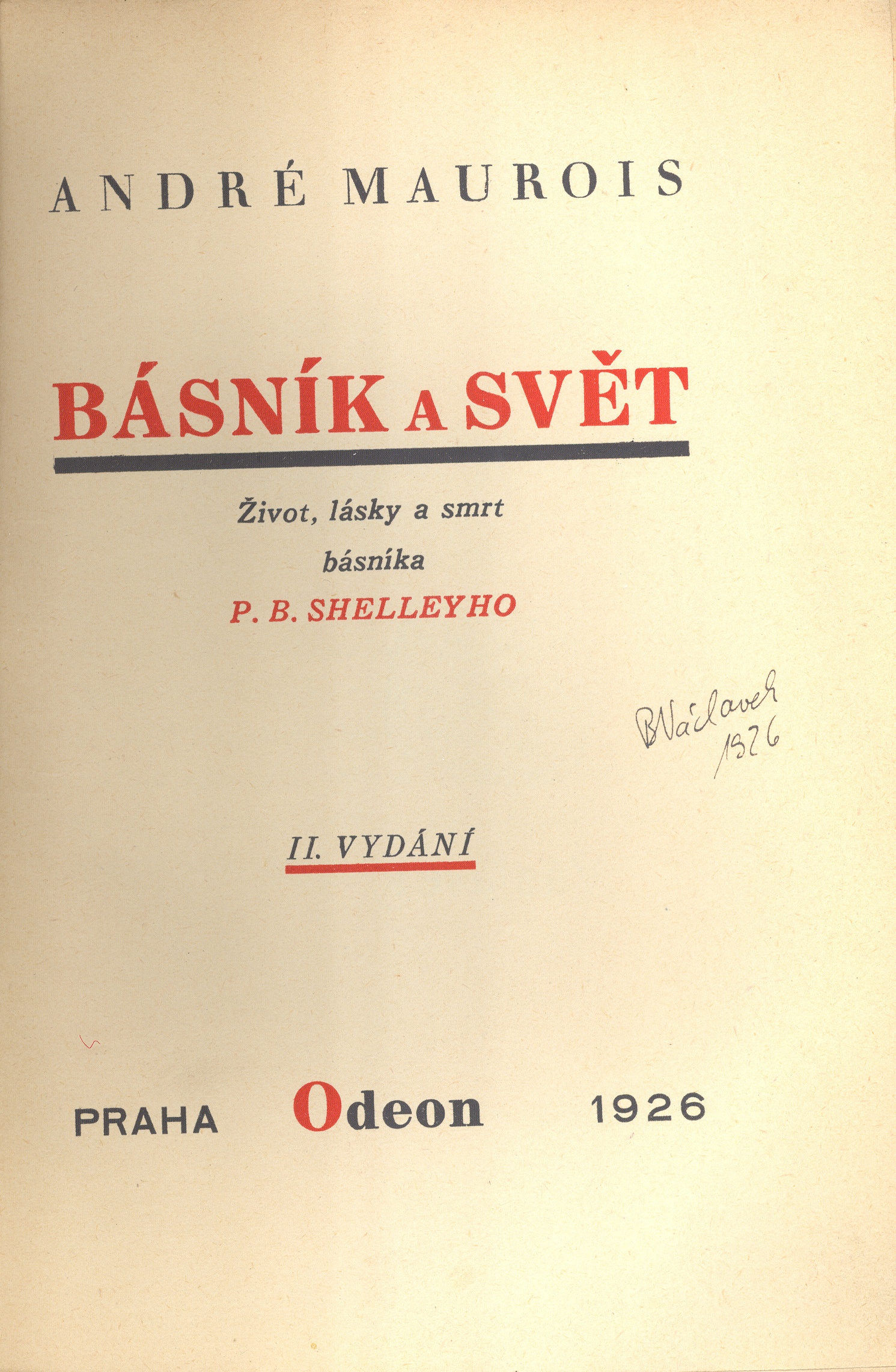 1. Title informationBásník a svět : život, lásky a smrt básníka P. B. Shelleyho / André Maurois ; [autorisovaný překlad Jar. Zaorálka ; titulní list podle návrhu K Teigeho ; obálka J. Jelínek]
