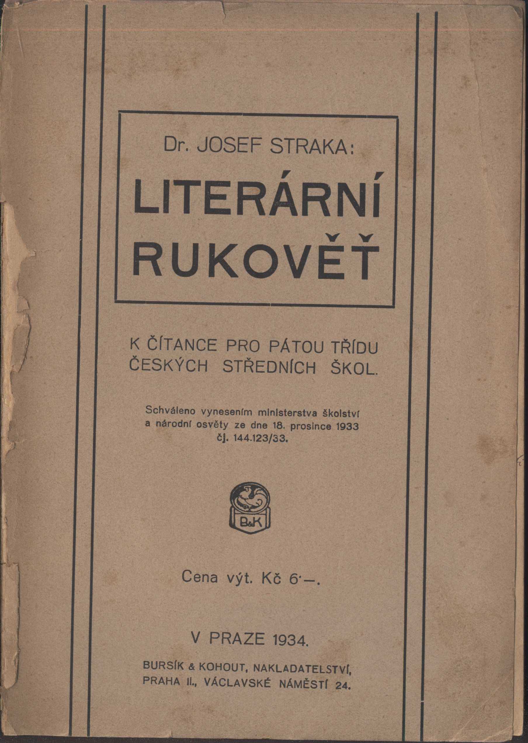 Title information Literární rukověť : k čítance pro pátou třídu českých středních škol / Josef Straka Personal name Straka, Josef, 1876-1963 (Author) (Dedicator) Další autoři Pražák, Albert, 1880-1956 (Former owner) (Dedicatee) Corporation Bursík a Kohout (nakladatelství, knihkupectví) (Publisher) Publication Praha : Bursík & Kohout, 1934 Scope 76 s. ISBN brož. Country Czech Republic Language Czech Note Typograficky řešená obálka. - Na titulním listu nakladatelský signet. - Úvod. - Rejstřík.