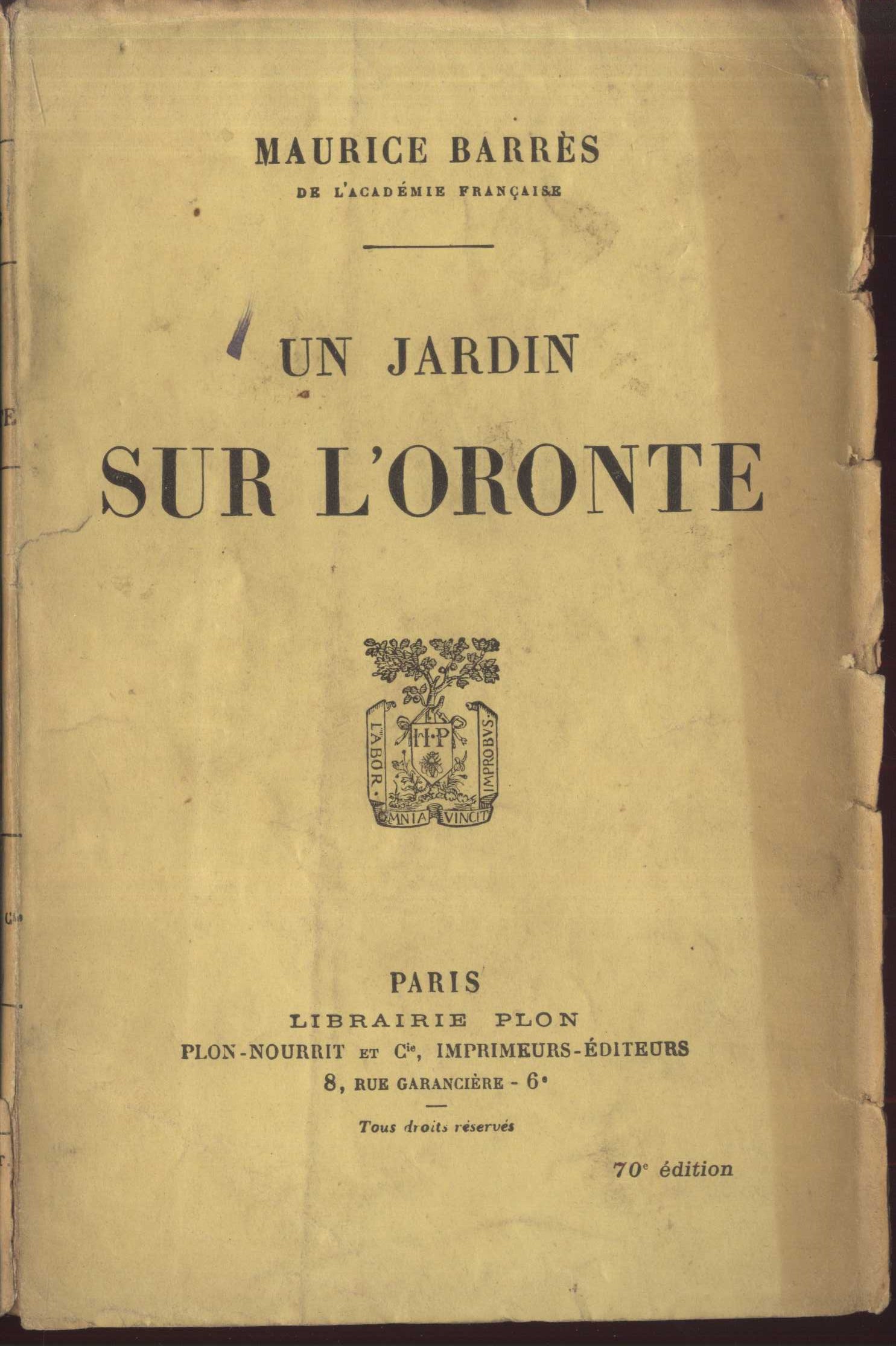 Title information Un Jardin sur l'Oronte / Maurice Barrès Personal name Barrès, Maurice, 1862-1923 (Author) Další autoři Pellé, Maurice César Joseph, 1863-1924 (Former owner) (Inscriber) Corporation Librairie Plon. Les petit-fils de Plon et Nourrit (Paris, Francie) (Publisher) (Printer) Publication Paris : Librairie Plon, copyright1922 Scope 307 s. ISBN (brožováno) Country France Language French Note Na obálce a titulním listu nakladatelský signet. - Informace o dalších dílech autora. - Nakladatelská reklama.