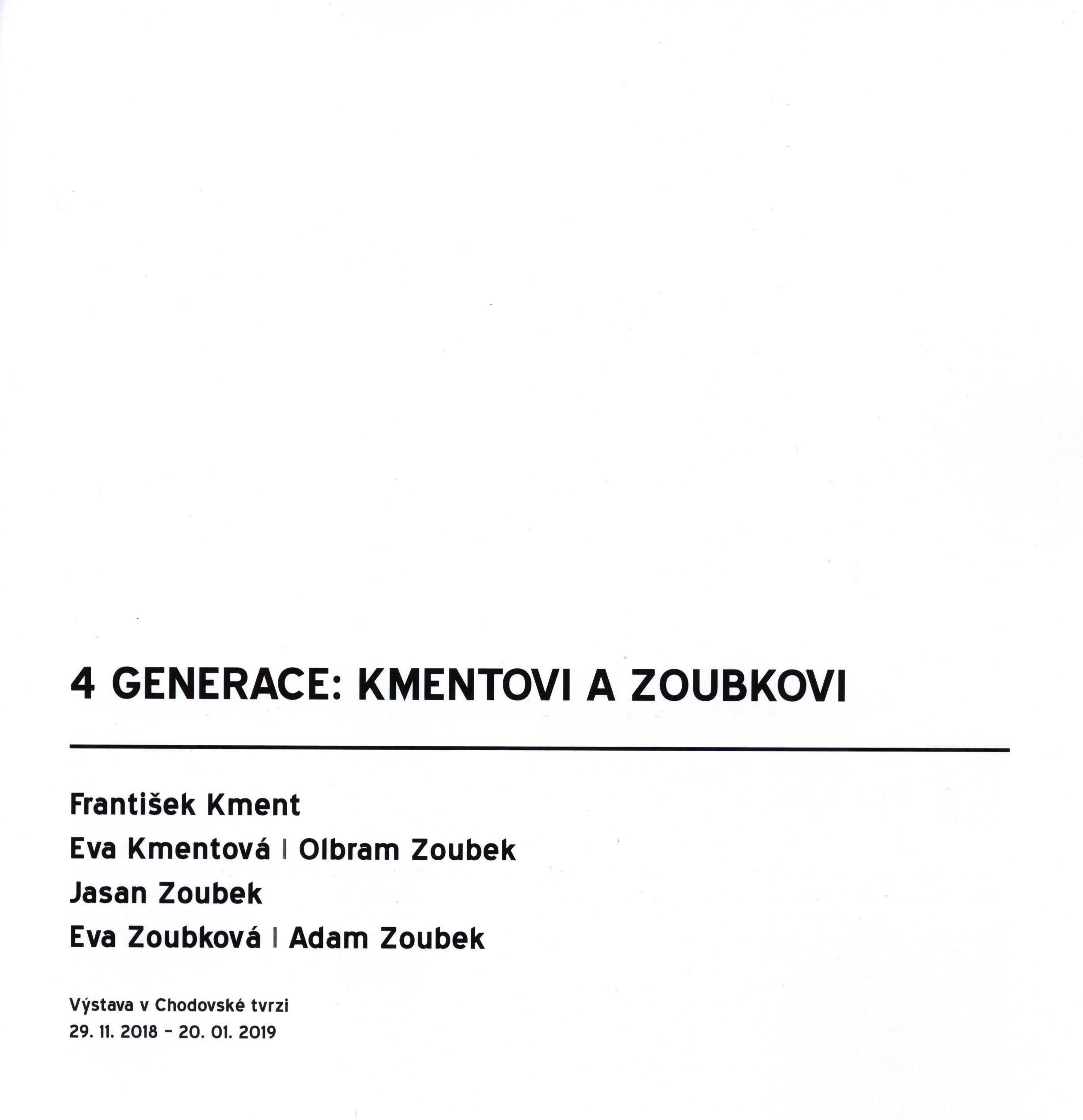 1. Title information4 generace: Kmentovi a Zoubkovi : František Kment, Eva Kmentová, Olbram Zoubek, Jasan Zoubek, Eva Zoubková, Adam Zoubek : výstava v Chodovské tvrzi 29. 11. 2018-20. 01. 2019 / texty v katalogu: Polana Bregantová ; grafická úprava: Karolína Lovětínská