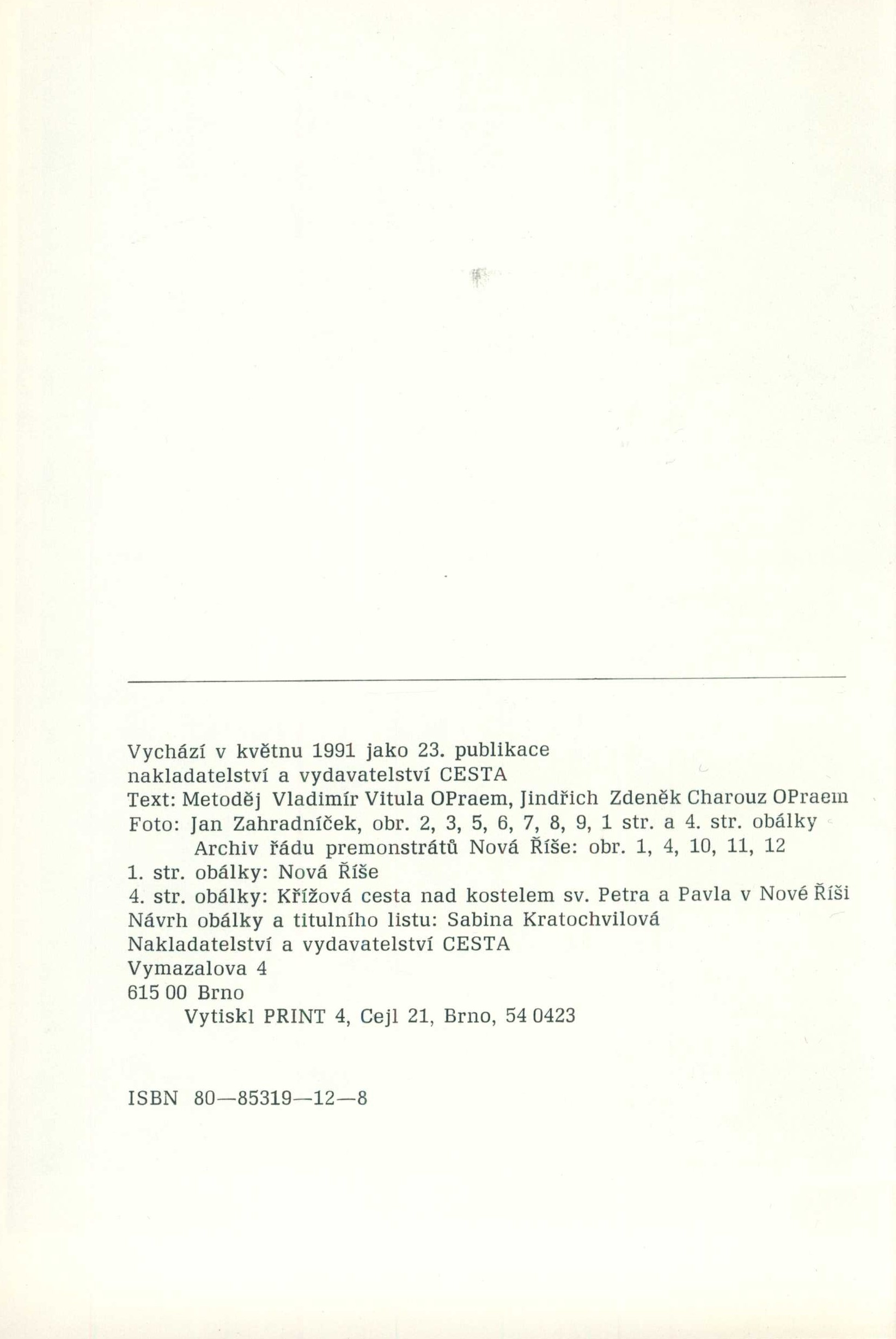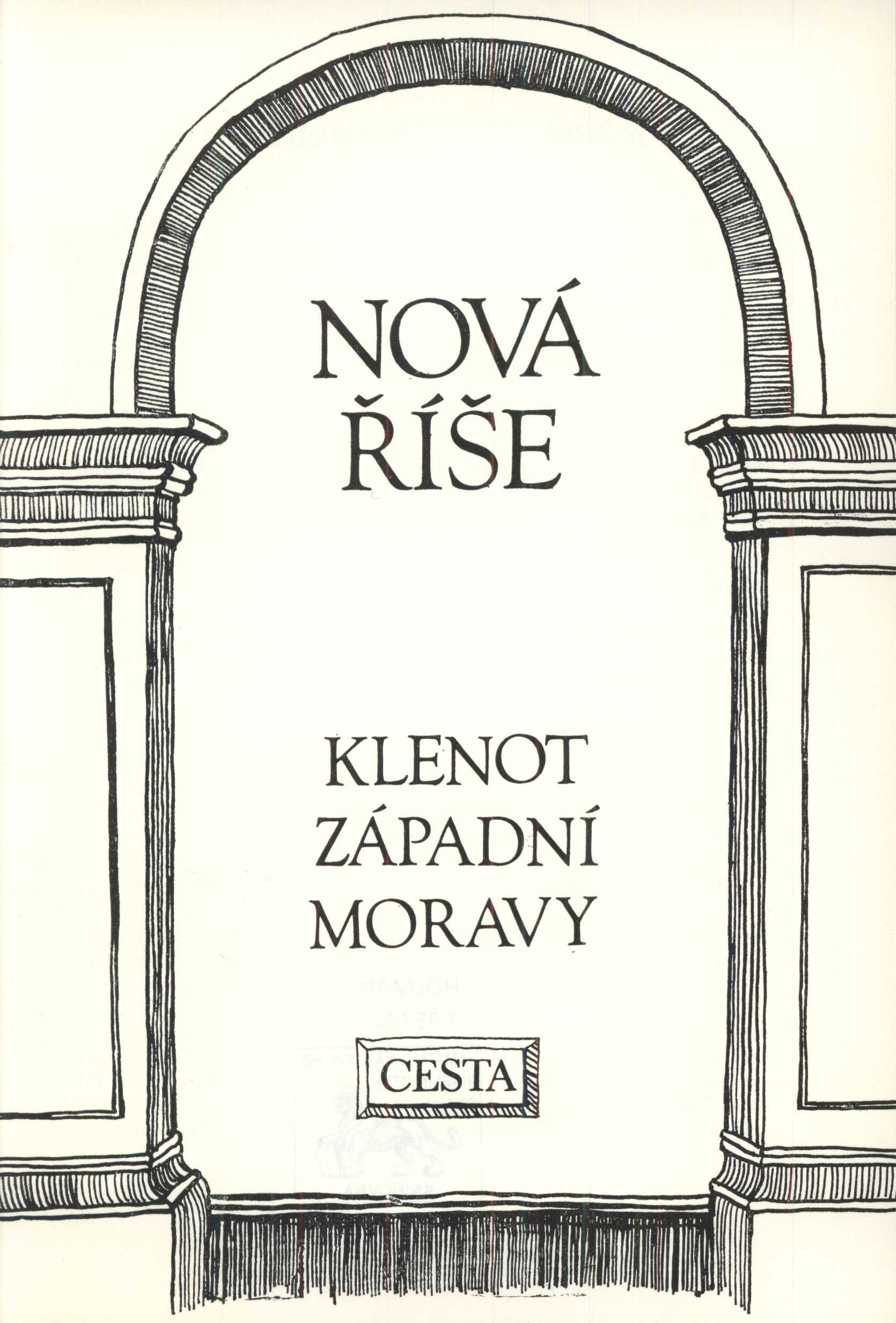 Title information Nová Říše : klenot západní Moravy / text Metoděj Vladimír Vitula, Jindřich Zdeněk Charouz ; návrh obálky a titulního listu Sabina Kratochvilová Personal name Vitula, Metoděj Vladimír, 1921-2002 (Author) Další autoři Charouz, Jindřich Zdeněk, 1959- (Author) Kratochvilová, Sabina, 1959- (Bookjacket designer) (Book designer) Corporation Cesta (nakladatelství) (Publisher) Print (tiskárna) (Printer) Publication Brno : Cesta, 1991 Manufacture Print 4 Scope 15 stran, 12 nečíslovaných stran obrazových příloh : ilustrace ; 21 cm ISBN 80-85319-12-8 (brožováno) Country Czech Republic Language Czech Note Zdobená tónovaná obálka. - Zdobený titulní list. - Černobílé celostránkové fotografie s popiskami v obrazové příloze.
