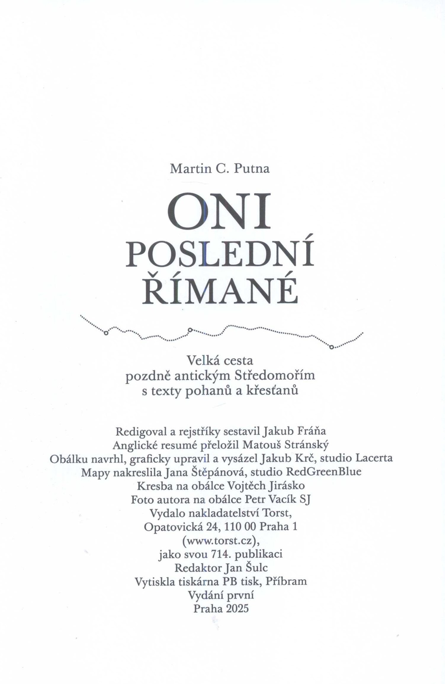 1. Title informationOni poslední Římané : velká cesta pozdně antickým Středomořím s texty pohanů a křesťanů / Martin C. Putna ; anglické resumé přeložil Matouš Stránský ; obálku navrhl, graficky upravil a vysázel Jakub Krč, studio Lacerta ; mapy nakreslila Jana Štěpánová, studio RedGreenBlue ; kresba na obálce Vojtěch Jirásko ; foto autora na obálce Petr Vacík SJ