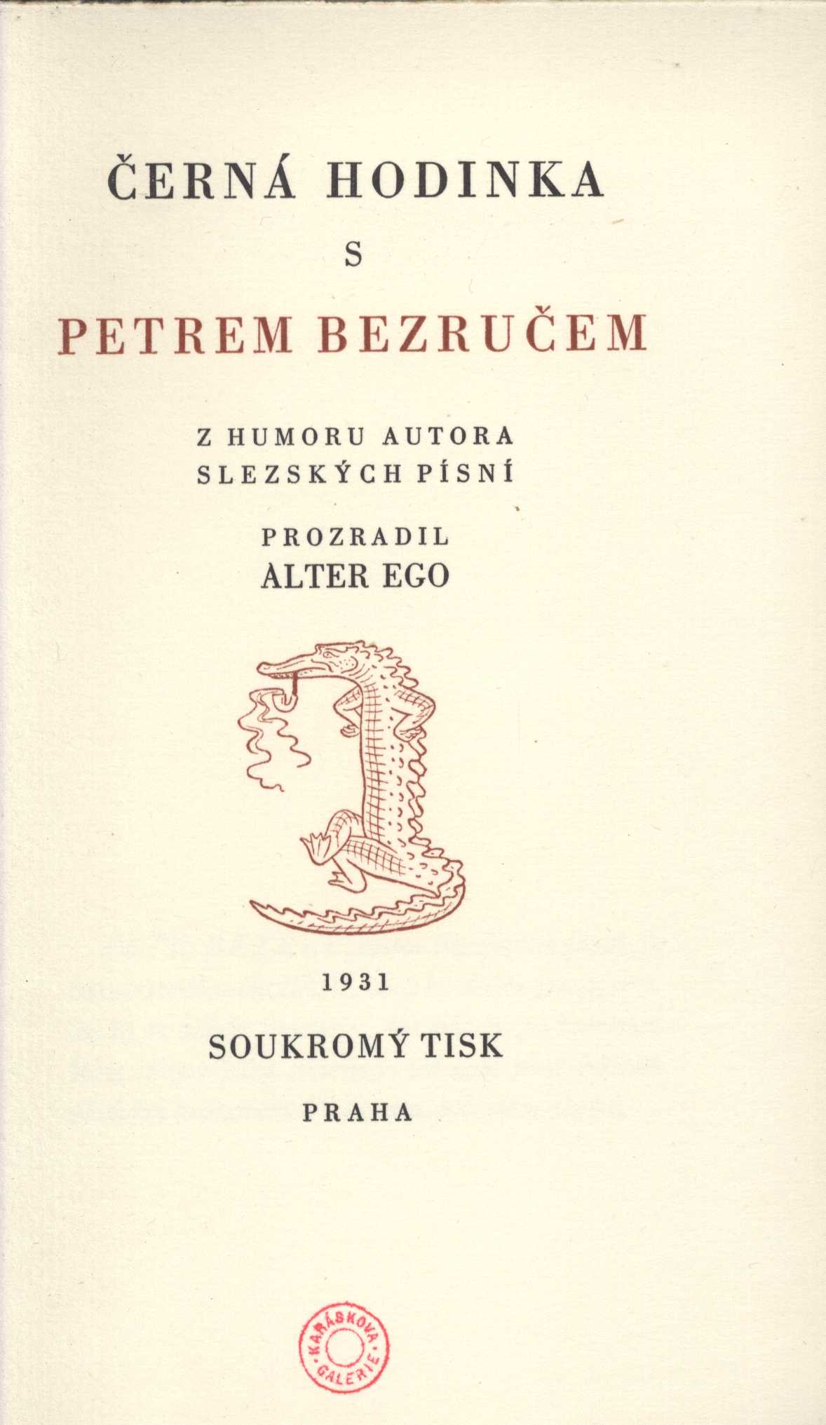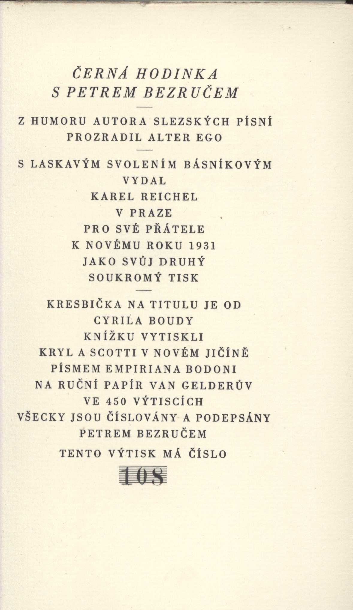 Title information Černá hodinka s Petrem Bezručem : z humoru autora Slezských písní / prozradil Alter Ego ; [kresbička na titulu je od Cyrila Boudy] Personal name Bezruč, Petr, 1867-1958 (Author) (Inscriber) Další autoři Bouda, Cyril, 1901-1984 (Illustrator) Karásek ze Lvovic, Jiří, 1871-1951 (Dedicatee) Reichel, Karel, 1895-1970 (Publisher) (Printer) Publication Praha : Karel Reichel, 1931 Scope 44 s. Country Czech Republic Language Czech Note Autorita nakladatele bude doplněna dodatečně po jeho přesném ověření. - Do přebalu s nalepeným štítkem vložen sešitý knižní blok. "S laskavým svolením básníkovým vydal Karel Reichel v Praze pro své přátele k novému roku 1931 jako svůj druhý tisk. Kresbička na titulu je od Cyrila Boudy. Knížku vytiskli Kryl a Scotti v Novém Jičíně písmem Empiriana Bodoni na ruční papír Van Gelderův ve 450 výtiscích. Všecky jsou číslovány a podepsány Petrem Bezručem." - Obsahuje vysvětlivky.