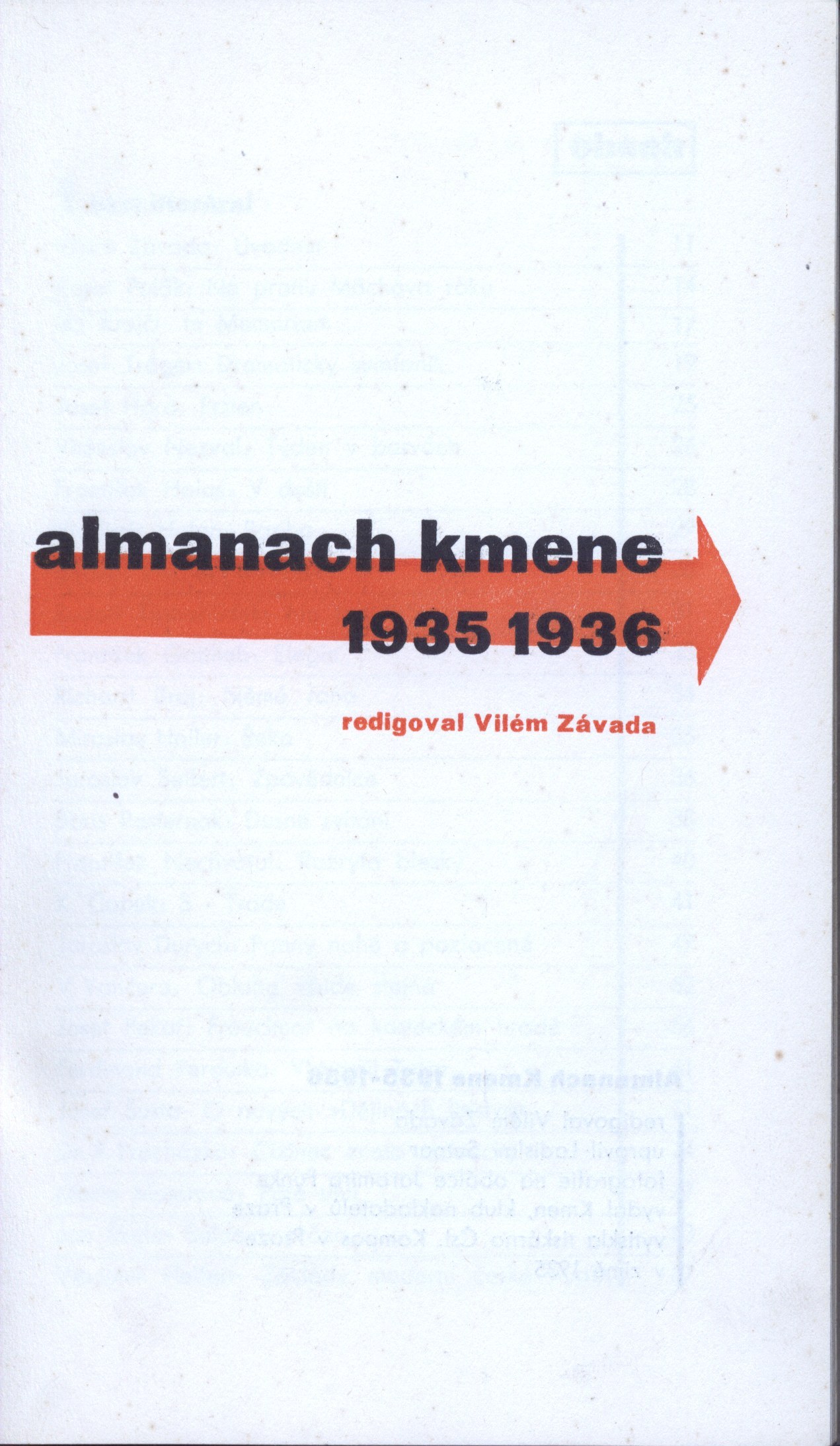 Barevná zdobená obálka. - Úprava Ladislava Sutnara. - Úvod Viléma Závady. - Černý a oranžový tisk titulního listu. - Obsahuje bibliografické údaje. - Obsahuje obrazové přílohy (celkem 18 listů): jeden list s reprodukcí ilustrace Antonína Procházky k Halasovým Starým ženám, šestnáct s různými fotografiemi (autoři a knihy), jeden barevný s ilustrací Josefa Čapka k Pohádce doktorské od Karla Čapka. - Černobílé ilustrace různých autorů. - Obsahuje beletristickou část s ukázkami z básnických, prozaických i odborných děl a posudky a informační část s edičními seznamy, seznamy členů Kmene a jeho knihkupecké sekce, popisem činnosti Kmene za období 1934-35 a seznamem publikací. - Na zadní záložce obálky informace o předešlých Almanaších Kmene, na přední reklama na Průvodce čtenářů 1936.