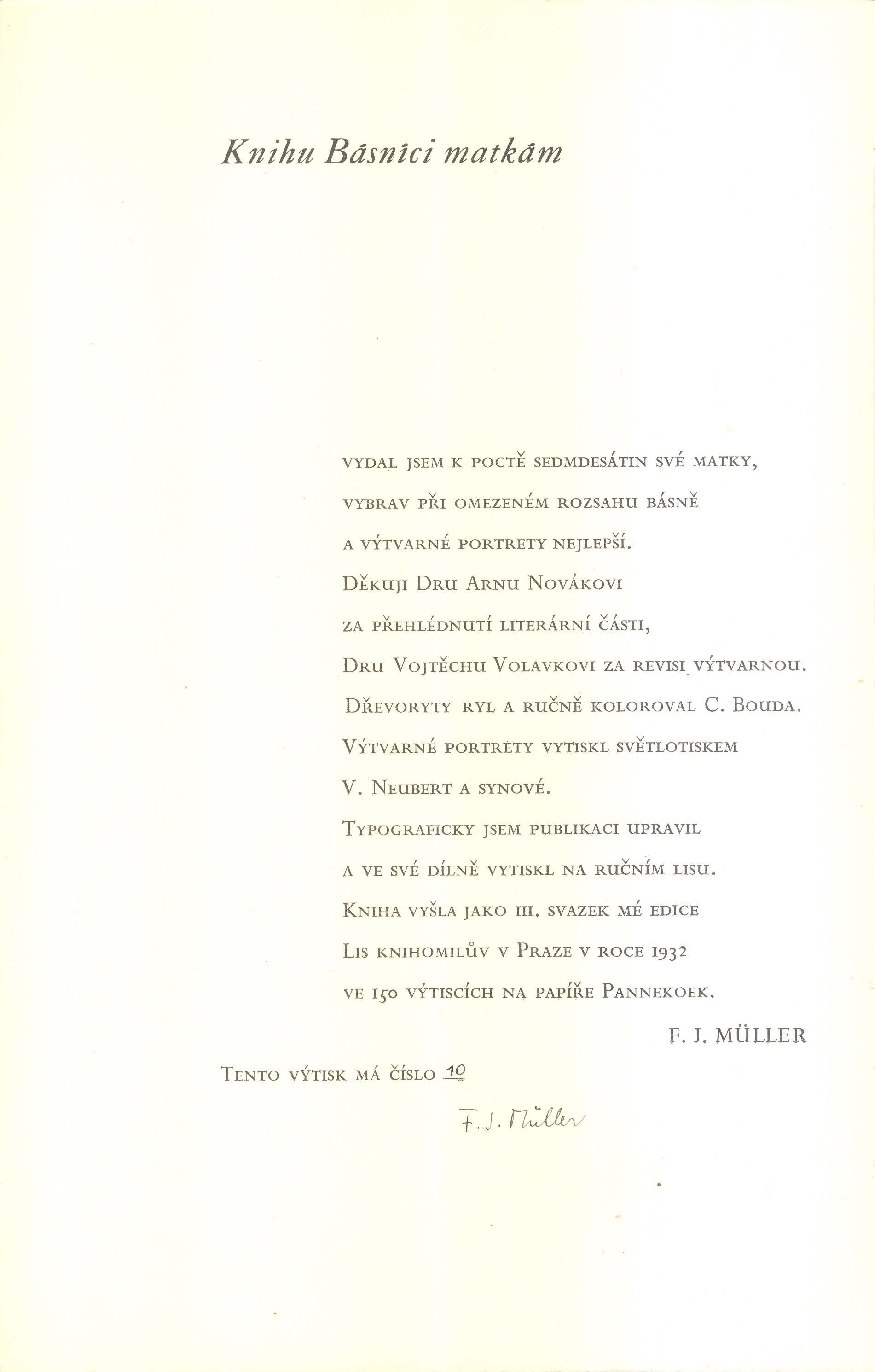 Title information Básníci matkám / [vydal jsem k poctě sedmdesátin své matky, vybrav při omezeném rozsahu básně a výtvarné portrety nejlepší ... F.J. Müller ; dřevoryty ryl a ručně koloroval C. Bouda ; děkuji Dru Arnu Novákovi za přehlédnnutí literární části, Dru Vojtěchu Volavkovi za revisi výtvarnou ; typograficky jsem publikaci upravil a ve své dílně vytiskl na ručním lisu] Personal name Müller, František Jan, 1896-1967 (Compiler) Další autoři Bouda, Cyril, 1901-1984 (Illustrator) Novák, Arne, 1880-1939 (Other) Volavka, Vojtěch, 1899-1985 (Other) Corporation V. Neubert a synové (firma) (Printer of plates) Publication Praha : Lis knihomilův, F.J. Müller, 1932 Manufacture (F. J. Müller) Scope [67] s., [16 l.] obr. příl. : il. ; 25,4 cm ISBN Brož. Edition Lis knihomilův III. svazek