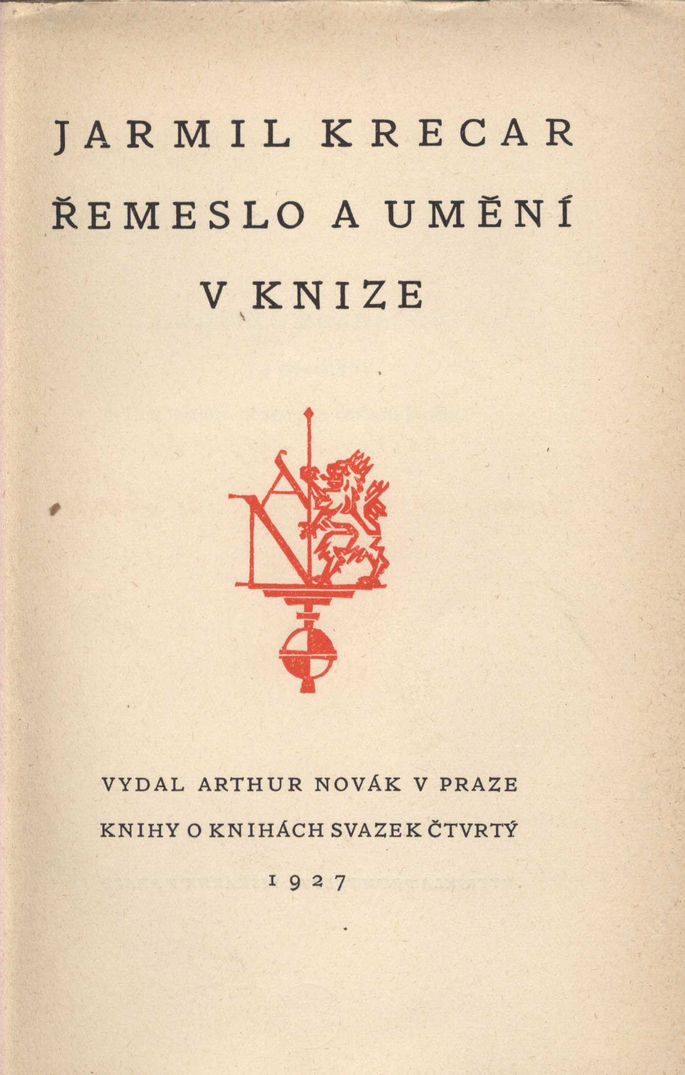 Title information Řemeslo a umění v knize / Jarmil Krecar Personal name Krecar z Růžokvětu, Jarmil, 1884-1959 (Author) (Dedicator) Další autoři Karásek ze Lvovic, Jiří, 1871-1951 (Dedicatee) Corporation Arthur Novák (nakladatelství) (Publisher) Průmyslová tiskárna v Praze (Printer) Publication V Praze : Arthur Novák, 1927 Manufacture (Průmyslová tiskárna) Scope 172 s., [12] s. obr. příl. : il. ; 19 cm ISBN brož. Edition Knihy o knihách svazek 4.