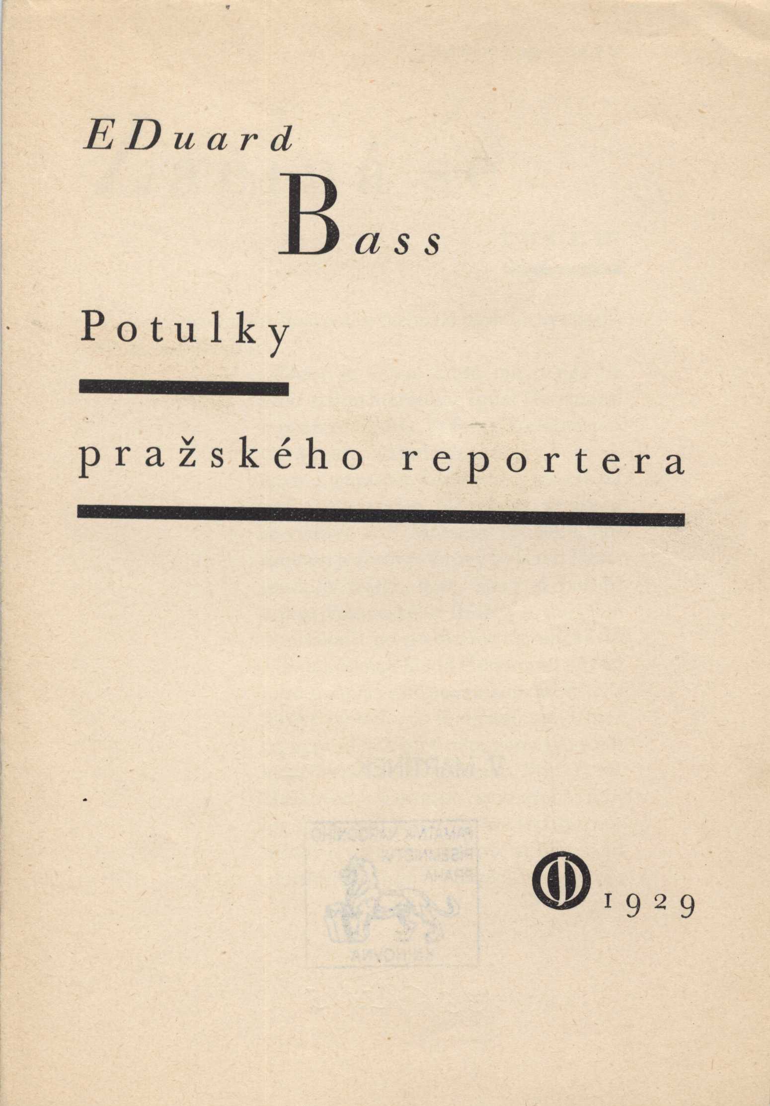 Title information Potulky pražského reportéra / Eduard Bass ; [frontispic nakreslil Ad. Hoffmeister ; typograficky knihu upravil Karel Svolinský] Personal name Bass, Eduard, 1888-1946 (Author) Další autoři Hoffmeister, Adolf, 1902-1973 (Illustrator) Svolinský, Karel, 1896-1986 (Typographer) Corporation J. Otto (nakladatelství) (Publisher) Průmyslová tiskárna v Praze (Printer) Publication V Praze : J. Otto, 1929 Manufacture (Průmyslová tiskárna) Scope 183 s. ISBN brož. Country Czech Republic Language Czech Note Ilustrace na obálce. - Frontispis.