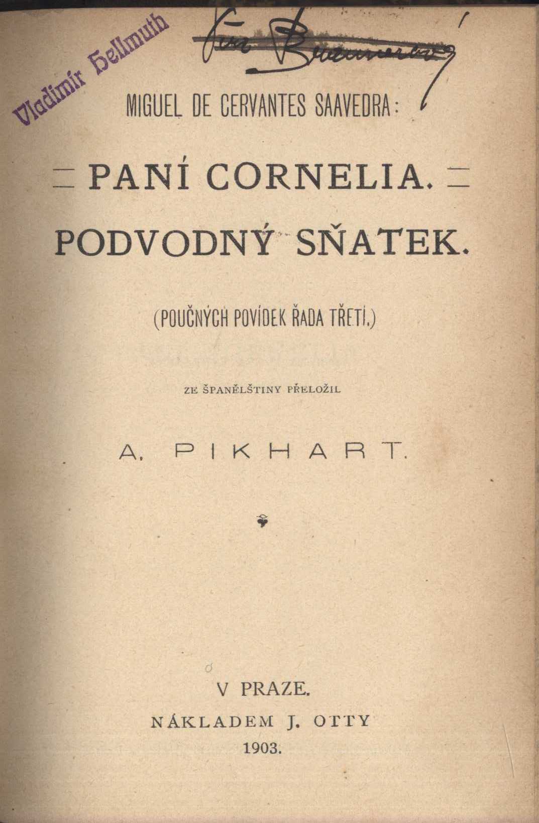Názvové údaje Paní Cornelia ; Podvodný sňatek / Miguel de Cervantes Saavedra ; ze španělštiny přeložil A. Pikhart. Poučných povídek řada 3. Osobní jméno Cervantes Saavedra, Miguel de, 1547-1616 (Autor) Další autoři Pikhart, Antonín, 1861-1909 (Překladatel) Hellmuthová, Věra, 1891-1940 (Dřívější majitel) Korp. J. Otto (nakladatelství) (Nakladatel, vydavatel) Česká grafická akciová společnost Unie (v Praze) (Tiskař) Nakladatel V Praze : Nákladem J. Otty, 1903 Výrobce (Tiskem České grafické společnosti "Unie") Rozsah 185 s. ISBN (váz.) Edice Světová knihovna č. 330-332