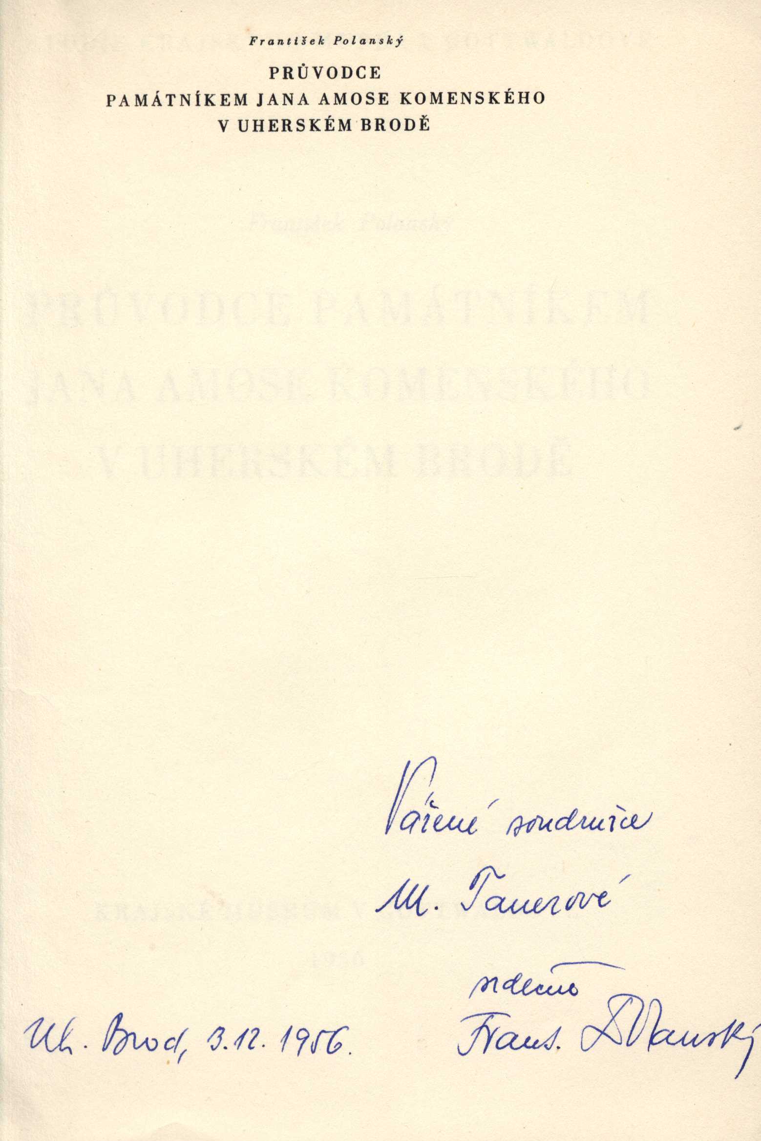 Title information Průvodce Památníkem Jana Amose Komenského v Uherském Brodě / František Polanský Personal name Polanský, František, 1911-1973 (Author) (Dedicator) Další autoři Krajské muzeum (Zlín, Česko) (Publisher) Brněnské tiskárny (Printer of plates) Publication V Gottwaldově : Krajské museum v Gottwaldově, 1956 Scope 56 stran : ilustrace, portréty, noty 21 cm ISBN (Brožováno) Edition Studie Krajského musea v Gottwaldově. Řada společenských věd ; č. 8