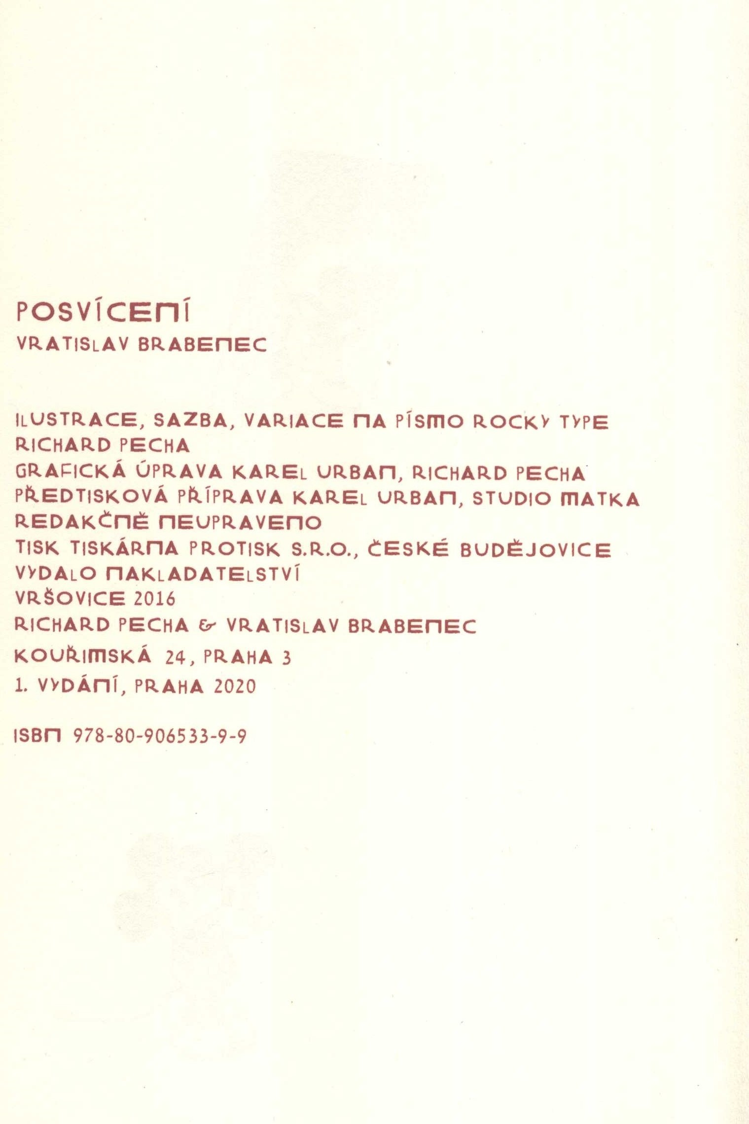 Title information Posvícení / Vratislav Brabenec ; ilustrace, sazba, variace na písmo Rocky Type Richard Pecha ; grafická úprava Karel Urban, Richard Pecha Personal name Brabenec, Vratislav, 1943- (Author) Další autoři Pecha, Richard, 1971- (Illustrator) (Compositor) (Book designer) Urban, Karel, 1975- (Book designer) Corporation Vršovice 2016 (nakladatelství) (Publisher) Protisk (tiskárna, České Budějovice) (Printer) Edition statement 1. vydání Publication Praha : Vršovice 2016, 2020 Manufacture České Budějovice : Tiskárna Protisk s.r.o. Scope 108 nečíslovaných stran : ilustrace ; 21 cm + 1 erratum (17 x 12 cm) ISBN 978-80-906533-9-9 (vázáno) Country Czech Republic Language Czech Note Část textu s názvem U pomníků v knize nevysázena, kompletní text obsahuje volně vložené erratum. - Barevná vazba s bílou ilustrací a textem (část anglicky), bílý plátěný hřbet.. - Barevné ilustrace (i celostránkové). - Ilustrace a o autorovi na zadní straně vazby.