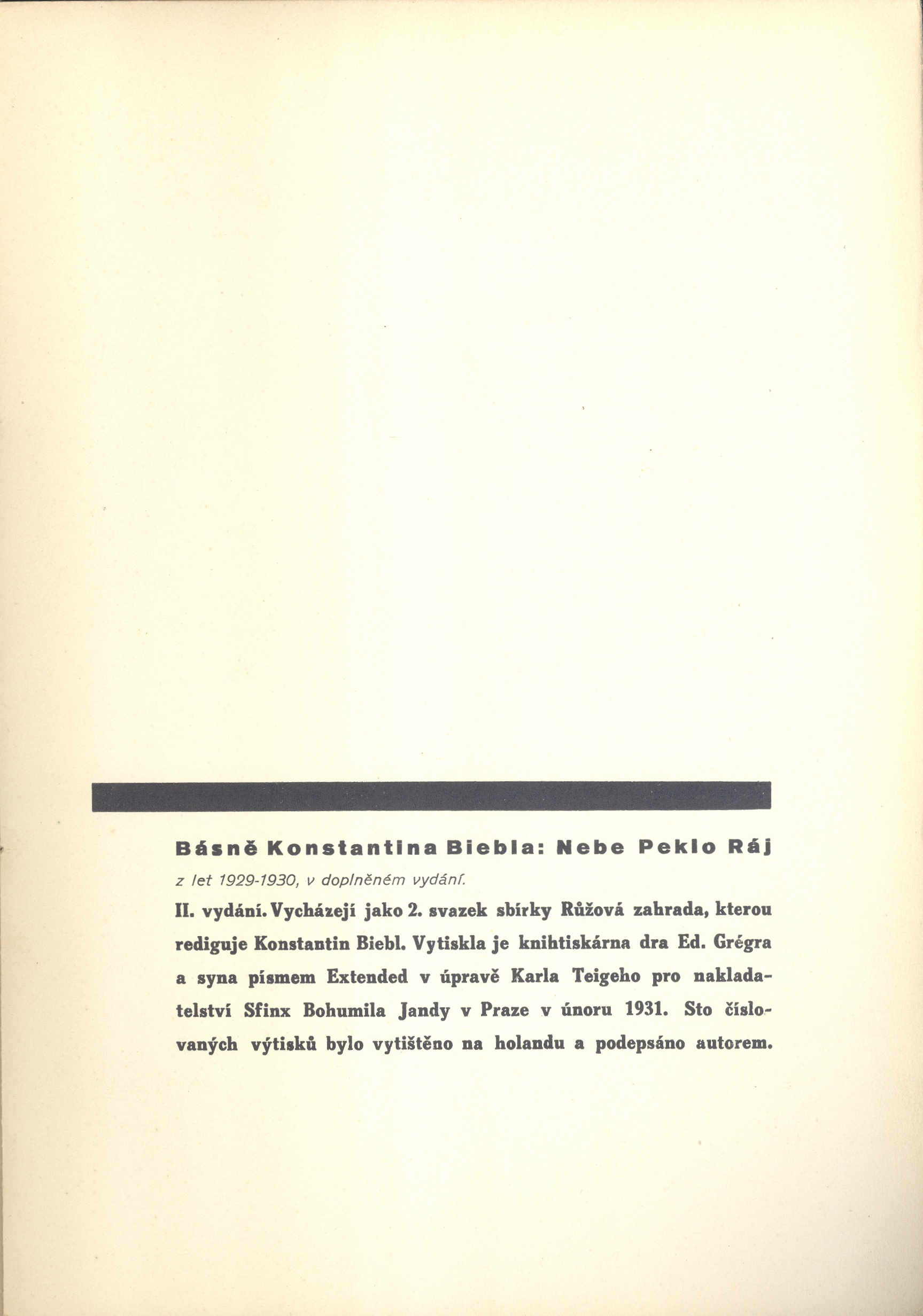 Růžová zahrada, (Sfinx, B. Janda)Country Czech Republic Language Czech Note V tiráži uvedeno jinak: Básně Konstantina Biebla: Nebe Peklo Ráj z let 1929-1930, v doplněném vydání. II. vydání. Vycházejí jako 2. svazek sbírky Růžová zahrada, kterou rediguje Konstantin Biebl.