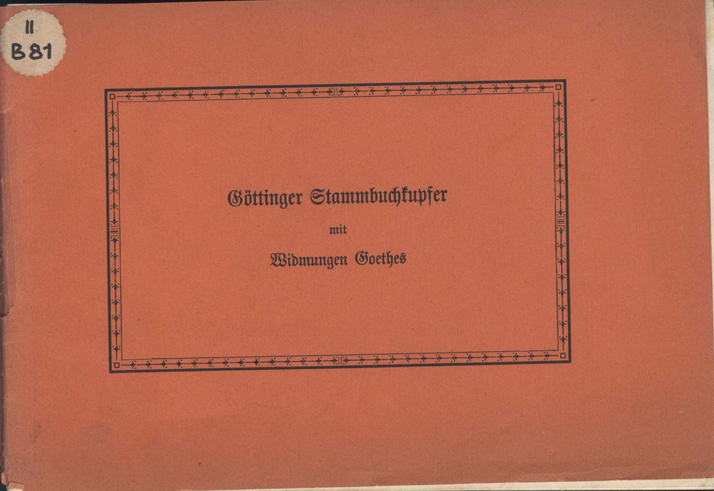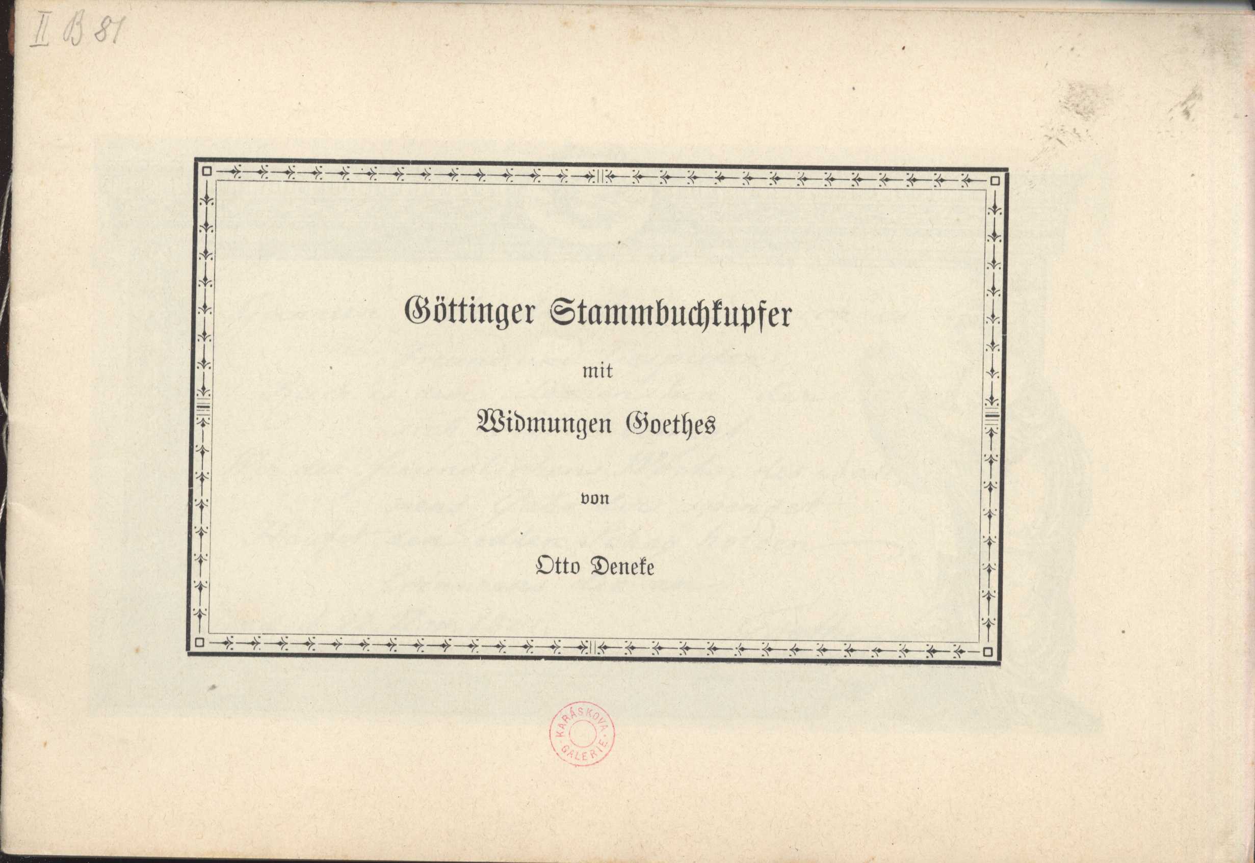 Title information Göttinger Stammbuchkupfer mit Widmungen Goethes / von Otto Deneke Personal name Deneke, Otto, 1875-1956 (Author) Publication [S. l. : s. n.], 1926 Scope [12] s., [6] l. obr. příl. : il. ISBN brož. Country Germany Language German Note Přední strana obálky zdobena rámcem. - Faksimile. - Sazba gotikou.