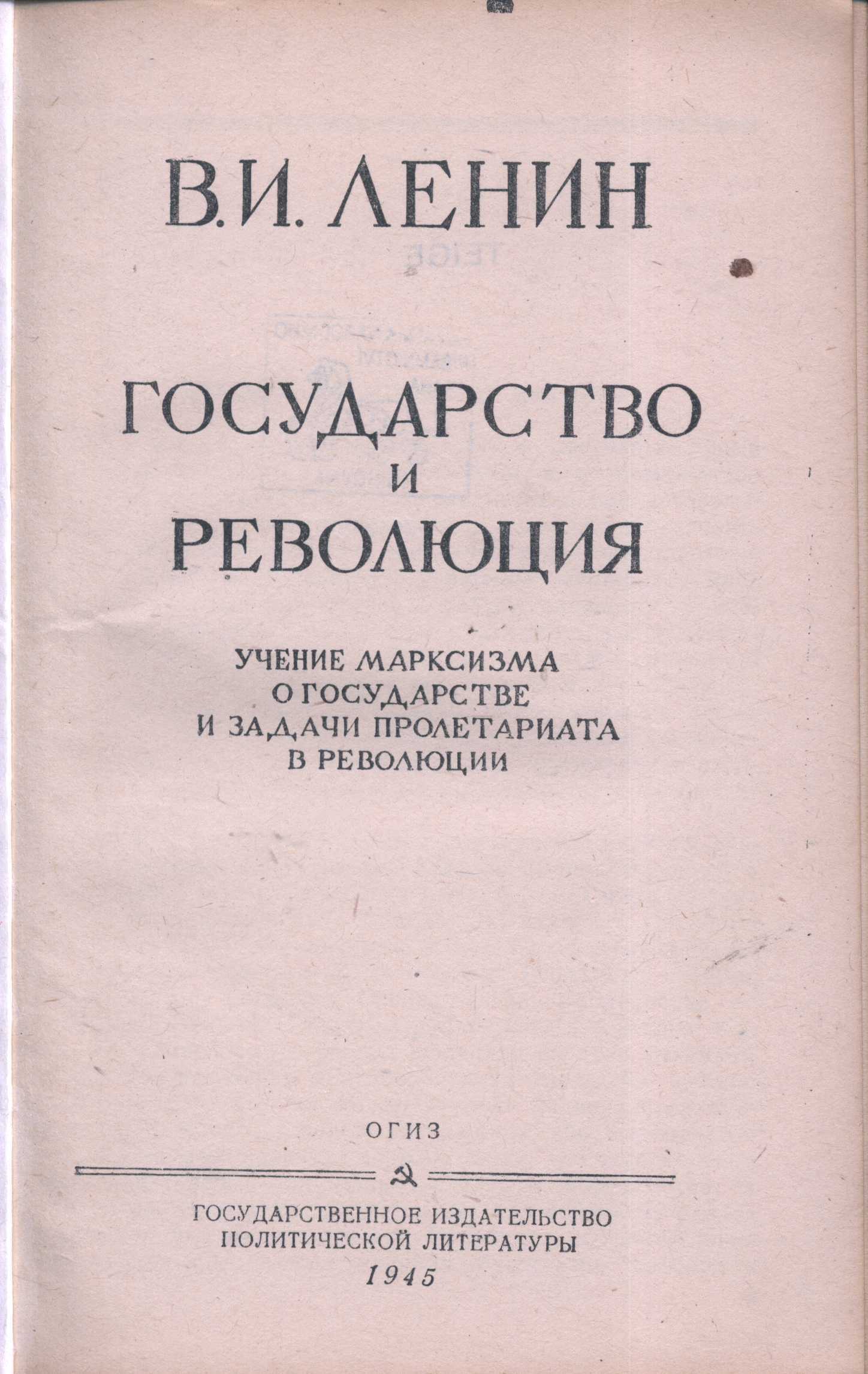 Title information Gosudarstvo i revoljucija : učenije marksizma o gosudarstve i zadači proletariata v revoljucii / V.I. Lenin Personal name Lenin, Vladimir Iľjič, 1870-1924 (Author) Publication Moskva : Gosudarstvennoje izdatel'stvo političeskoj literatury, 1945 Scope 97 s. ISBN brož. Country Russia (Federation) Language Russian Note Obálka. - Předmluva.