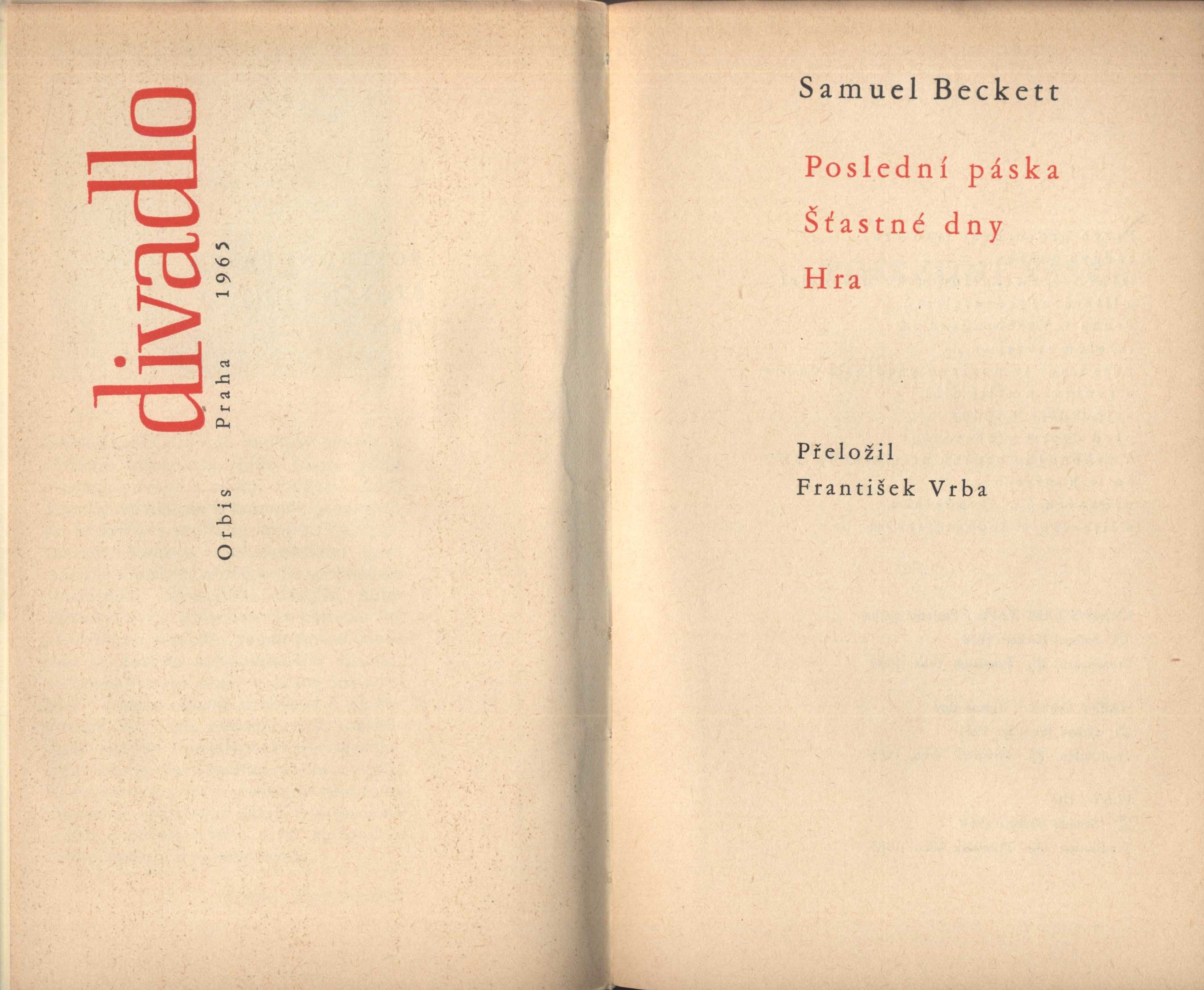 Title information Poslední páska ; Šťastné dny ; Hra / Samuel Beckett ; přeložil František Vrba Personal name Beckett, Samuel, 1906-1989 (Author) Další autoři Vrba, František, 1920-1985 (Translator) Pujman, Petr, 1929-1989 (Author of afterword, colophon, etc.) Mejstřík, Milan, 1932- (Bookjacket designer) Další var.názvy Šťastné dny Hra Edition statement 1. vydání Publication Praha : Orbis, 1965 Manufacture Praha : Knihtisk n. p., provoz 2 Scope 87 stran ; 20 cm ISBN (Brožováno) Edition Edice Divadlo ; sv. 73