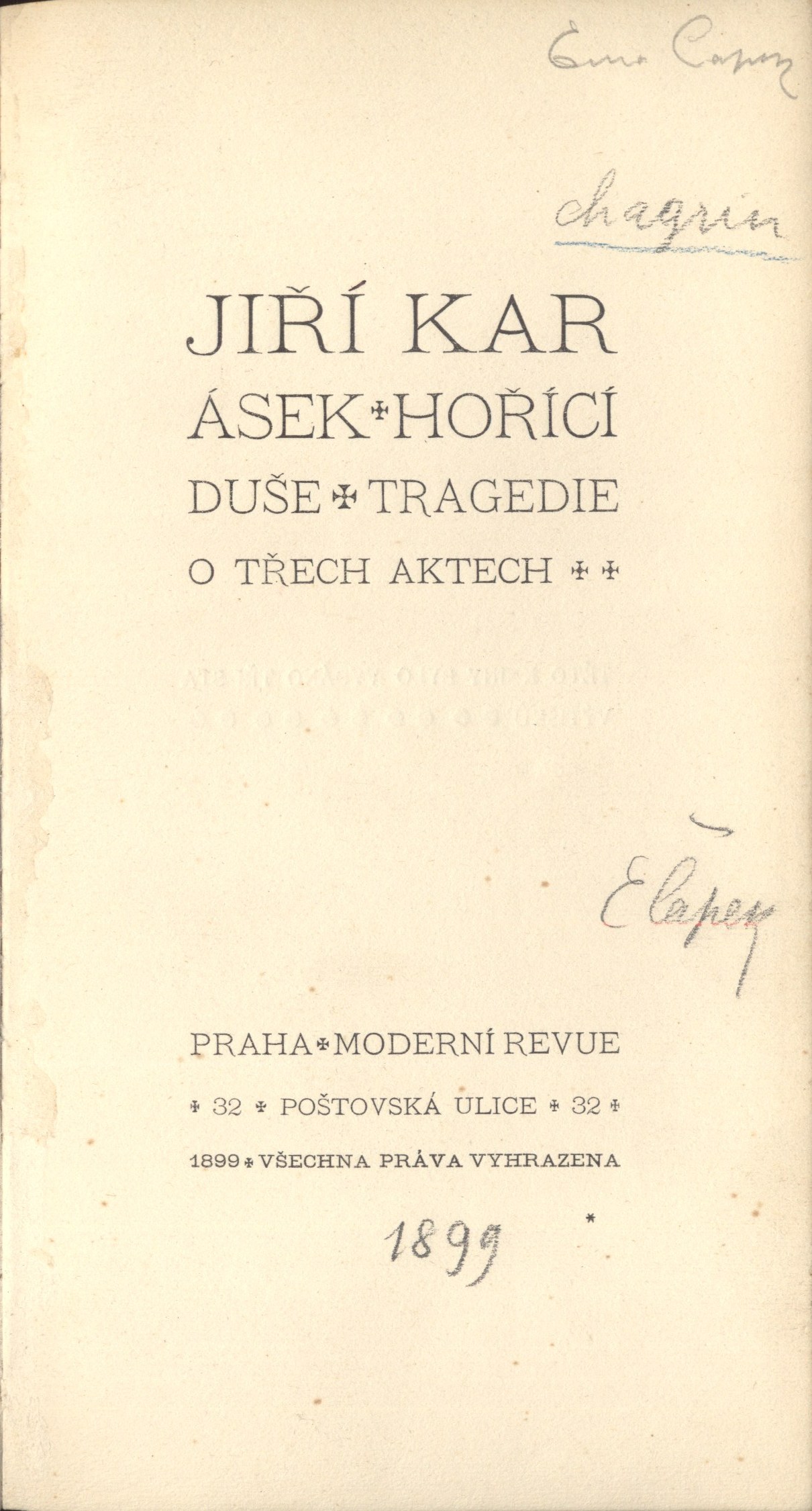 Title information Hořící duše : tragedie o třech aktech / Jiří Karásek Personal name Karásek ze Lvovic, Jiří, 1871-1951 (Author) Další autoři Hlaváček, Karel, 1874-1898 (Illustrator) Čapek, Emil, 1880-1960 (Former owner) Corporation Moderní revue (nakladatelství) (Publisher) Emanuel Stivín (v Praze) (Printer) (Printer of plates) Další var.názvy Tragedie Publication Praha : Moderní revue, 1899 Manufacture (v knihtiskárně Emanuela Stivína) Scope 92 s. : il. ; 20 cm ISBN (váz.) Edition [Knihovna moderní revue] [svazek 25.]