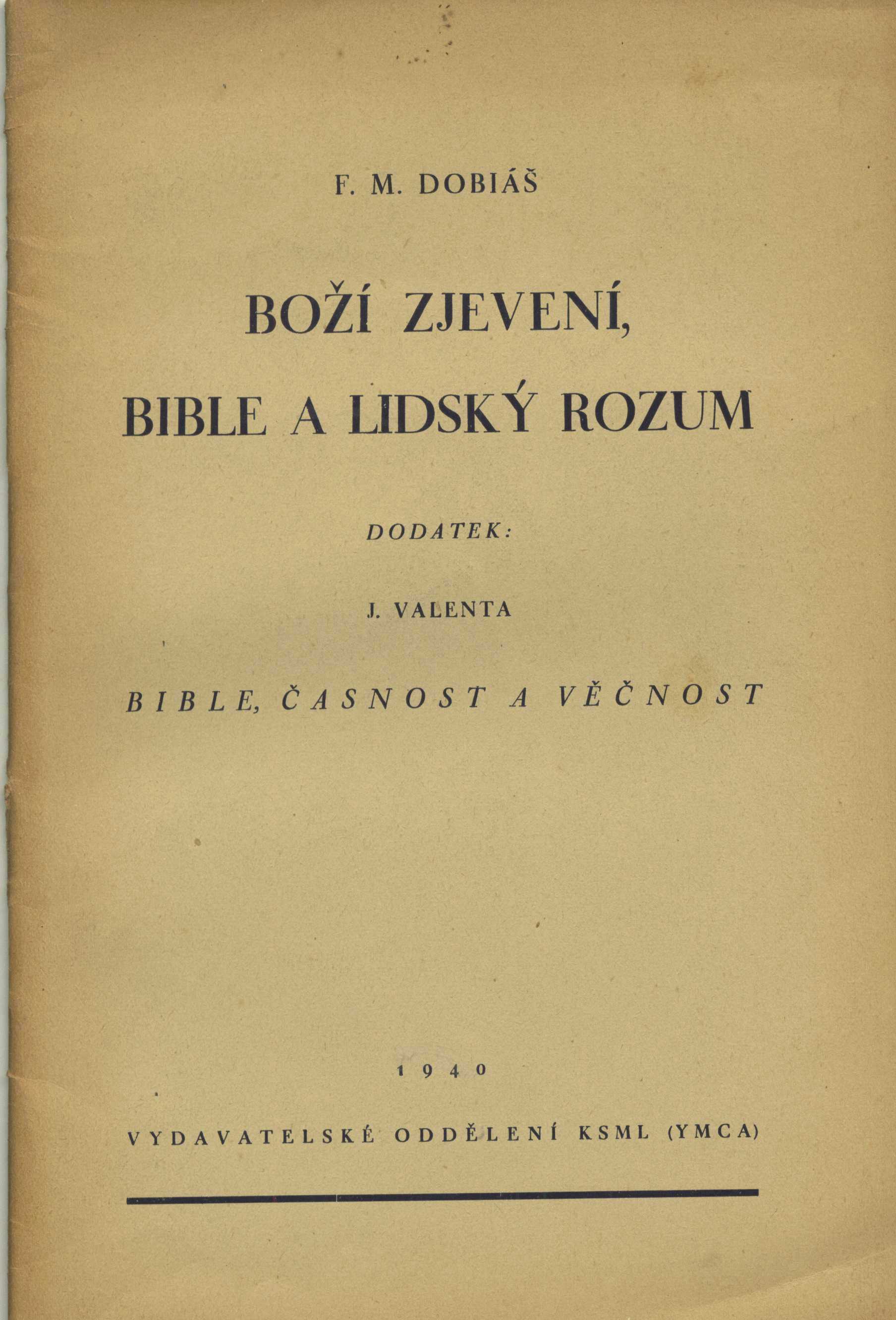 Title information Boží zjevení, bible a lidský rozum / F.M. Dobiáš Personal name Dobiáš, František Mrázek, 1907-1972 (Author) Další autoři Valenta, Jaroslav, 1911-1942. Bible časnost a věčnost (Author) Patočka, Jan, 1907-1977 (Dedicatee) Corporation Oldřich Lejsek (Praha, Česko) (Printer) Publication Praha : Vydavatelské oddělení KSML (YMCA), 1940 Manufacture Knihtiskárna O. Lejsek Scope 22 stran ; 23 cm ISBN (Brožováno) Country Czech Republic Language Czech Note Typografická obálka. - Na zadní straně obálky nakladatelská inzerce.