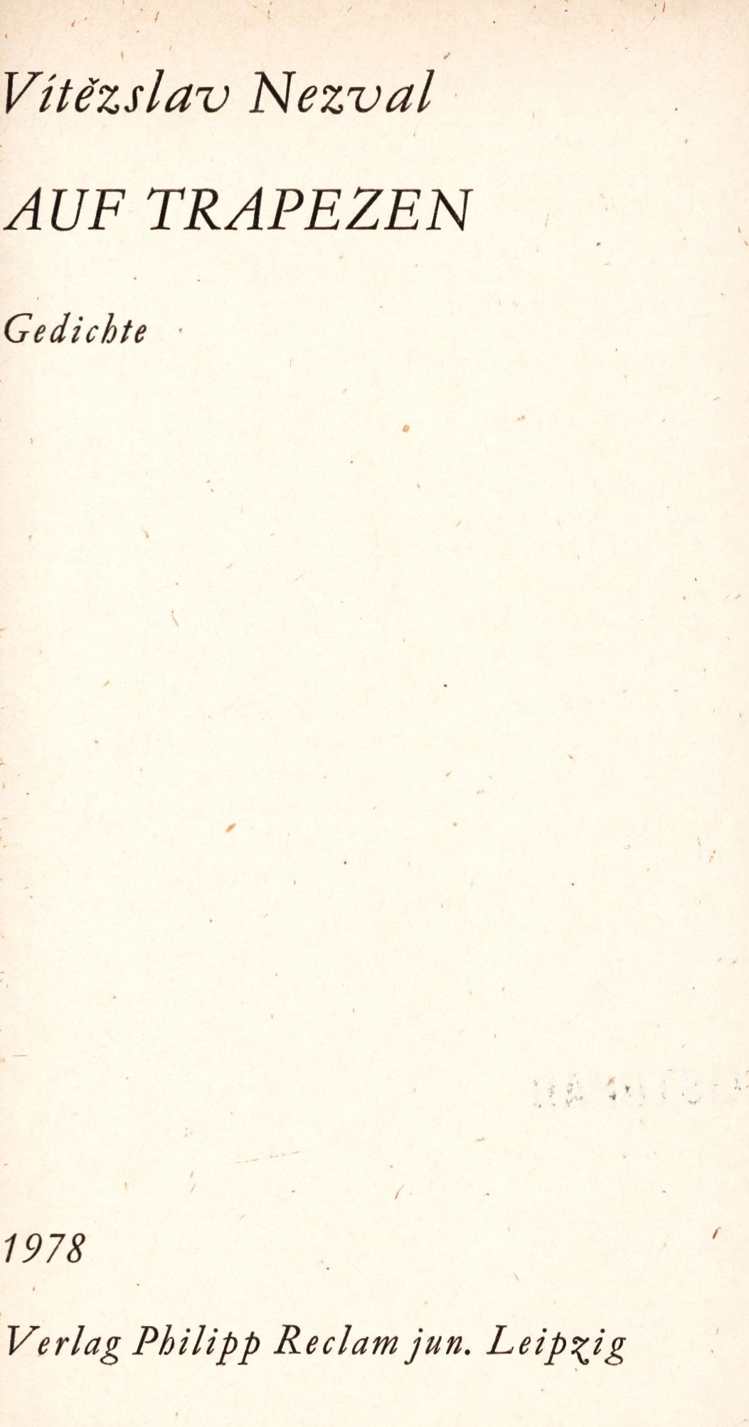 Title information Auf Trapezen : Gedichte / Vítězslav Nezval ; herausgegeben und mit einem Vorwort versehen von Ludvík Kundera ; Illustration von Jindřich Štyrský Personal name Nezval, Vítězslav, 1900-1958 (Author) Další autoři Kundera, Ludvík, 1920-2010 (Editor) (Author of introduction) Listopad, František, 1921-2017 (Dedicatee) Štyrský, Jindřich, 1899-1942 (Illustrator) Corporation Philipp Reclam jun. (nakladatelství a tiskárna) (Publisher) Edition statement 1. Auflage Publication Leipzig : Philipp Reclam jun., 1978 Scope 182 stran, 16 stran obrazových příloh : černobílé reprodukce, ilustrace ; 18 cm ISBN (brožováno) Edition Reclams Universal-Bibliothek. Belletristik ; Band 730