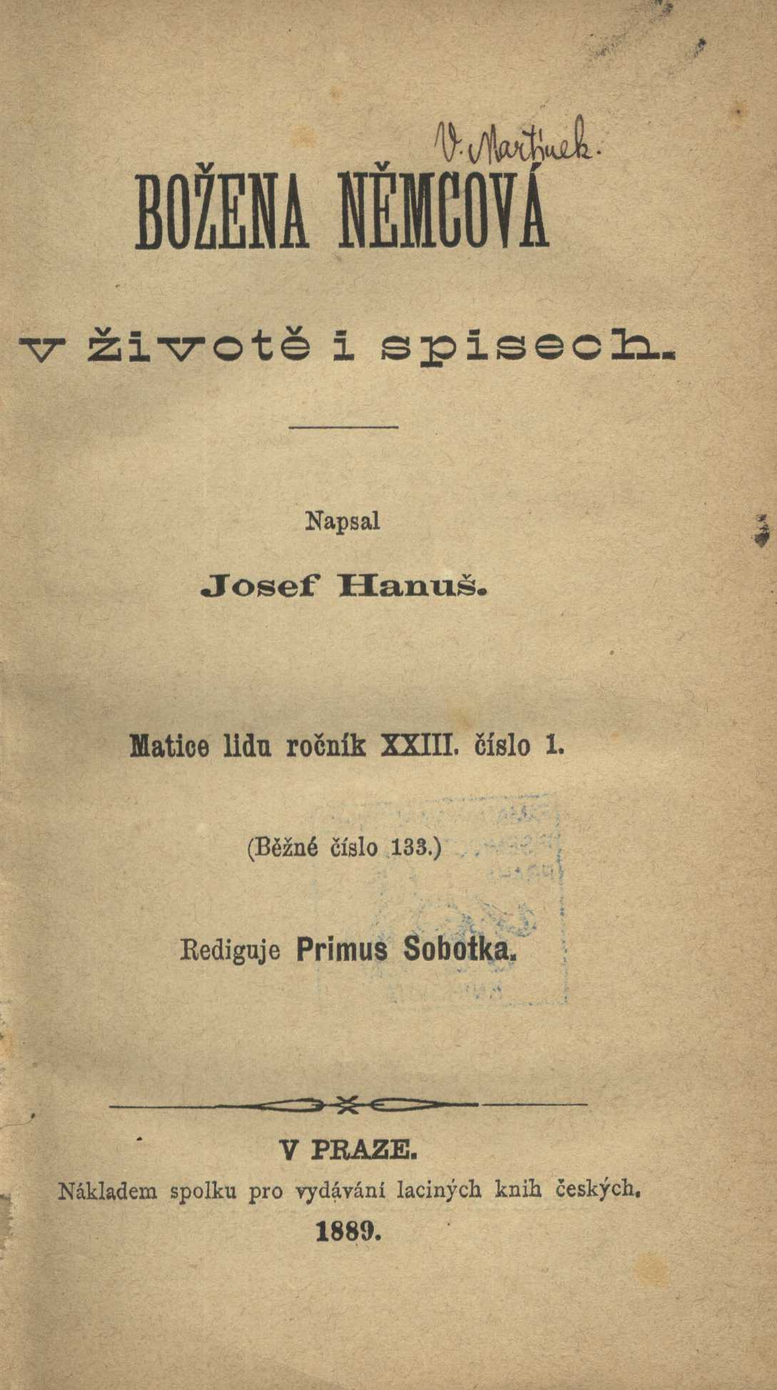 Matice lidu (Spolek pro vydávání laciných knih českých)Country Czech Republic Language Czech Note Na titulním listu nad impresem ozdobná linka. - Obsahuje úvod autora.