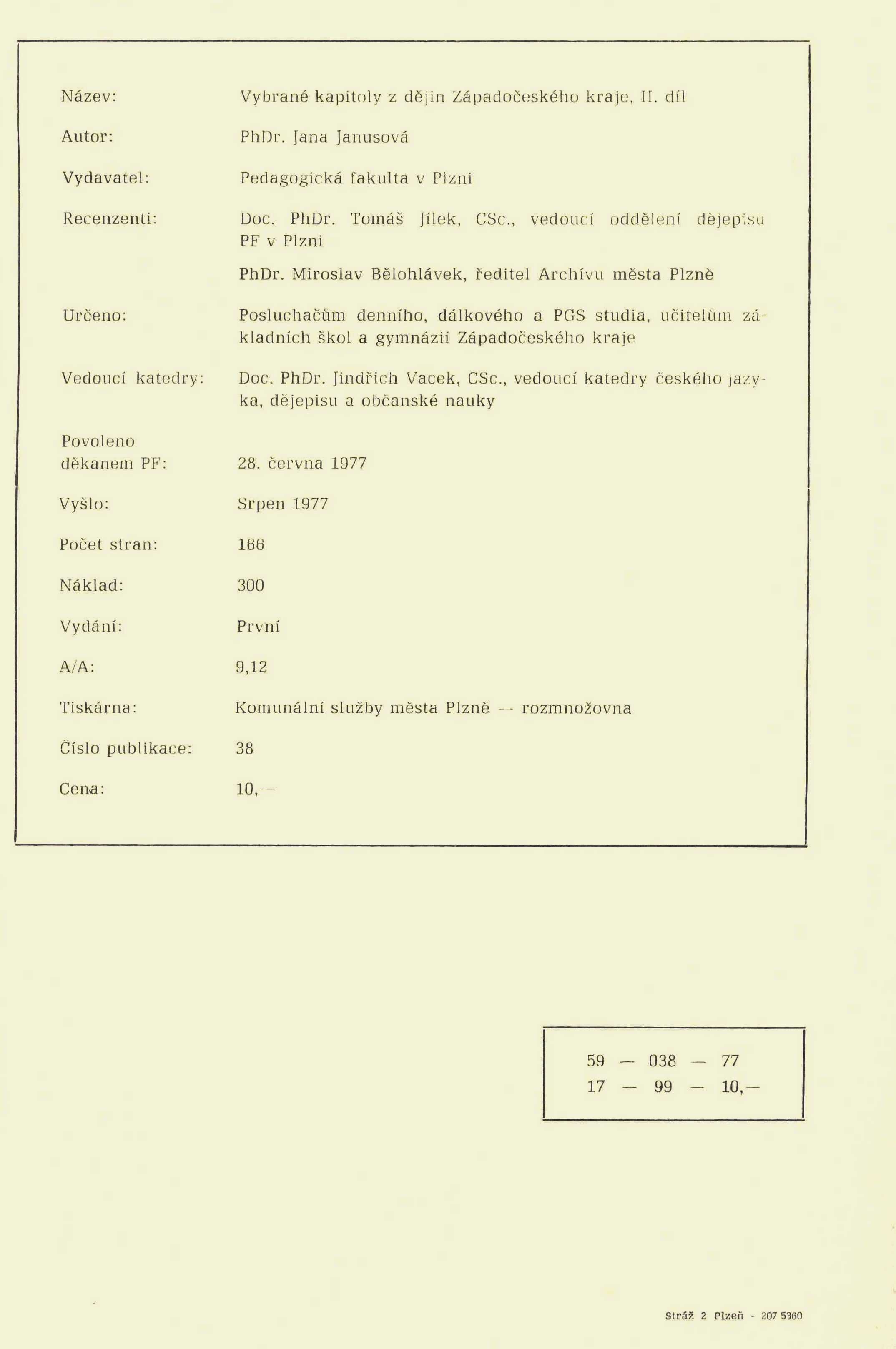Title information Vybrané kapitoly z dějin Západočeského kraje / Jana Janusová. II. díl Personal name Janusová, Jana, 1941-1998 (Author) Další autoři Pedagogická fakulta v Plzni (Publisher) Edition statement Vyd. 1. Publication Plzeň : Pedagogická fakulta v Plzni, 1977 Manufacture (Komunální služby města Plzně - rozmnožovna) Scope 166 s., [3] l. obr. příl. : il., mp. ISBN brož. Edition Učební texty vysokých škol 38