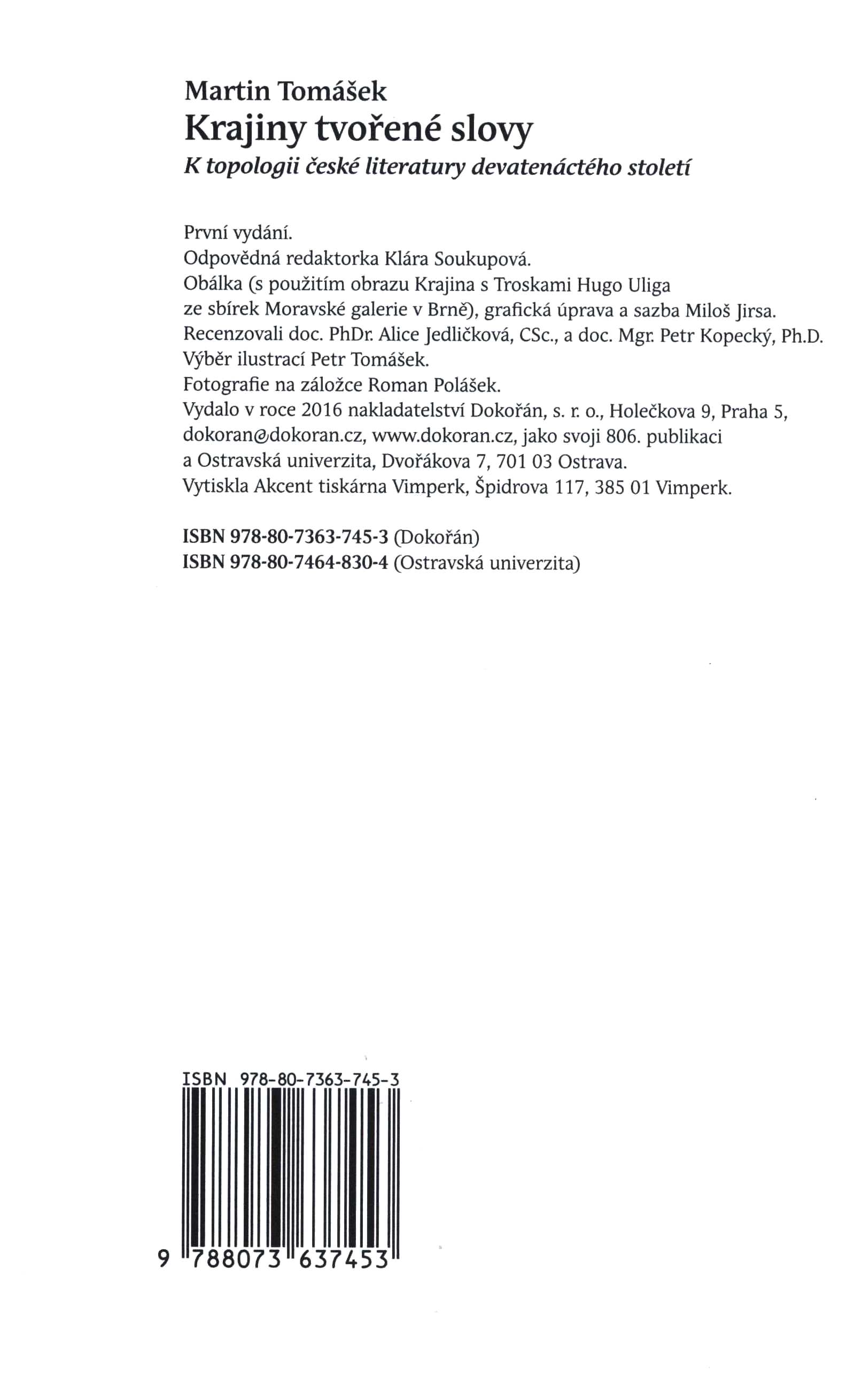 Title information Krajiny tvořené slovy : k topologii české literatury devatenáctého století / Martin Tomášek ; obálka (s použitím obrazu Krajina s Troskami Hugo Uliga ...), grafická úprava a sazba Miloš Jirsa Personal name Tomášek, Martin, 1969- (Author) Další autoři Jirsa, Miloš (Bookjacket designer) (Book designer) (Compositor) Ullik, Hugo, 1838-1881 (Artist) Edition statement První vydání Publication Praha : Dokořán ; Ostrava : Ostravská univerzita, 2016 Manufacture Vimperk : Akcent Scope 375 stran : ilustrace ; 24 cm ISBN 978-80-7363-745-3 (Dokořán ; vázáno) 978-80-7464-830-4 (Ostravská univerzita ; vázáno) Country Czech Republic Language Czech Note Zdobený barevný přebal. - Tónovaná typografická vazba. - Na přední záložce přebalu anotace knihy, na zadní záložce bio-bibliografická poznámka o autorovi s fotem. - Nakladatelské značky na titulním listu. - Obsah. - Předmluva. - Jednotlivé kapitoly. - Černobílé reprodukce obrazů s popiskami. - Shrnutí. - Ediční poznámka. - Obsahuje bibliografii, bibliografické odkazy a rejstřík. - Anglické resumé. - Barevná reprodukce obrazu a text na zadní straně přebalu.