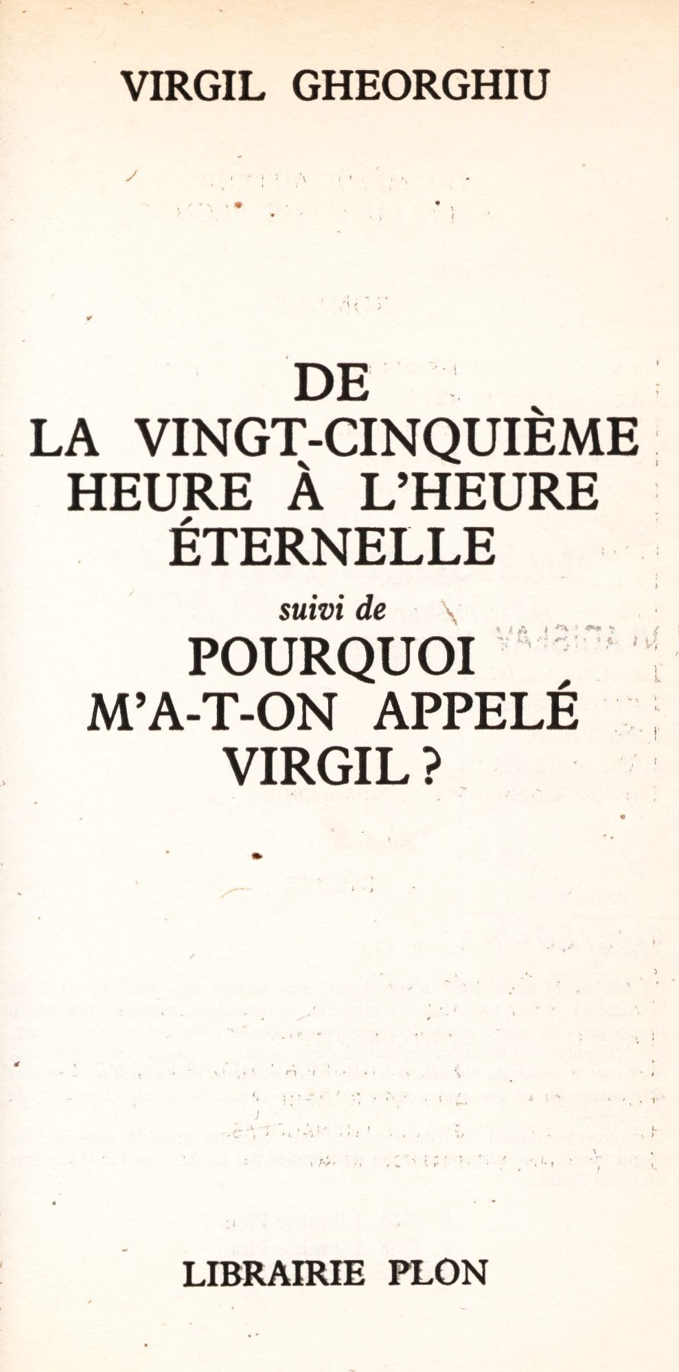 Title information De la Vingt-Cinquième Heure à l'heure éternelle : Suivi de Pourquoi m'a-t-on appele Virgil ? Virgil Gheorghiu Personal name Gheorghiu, Virgil, 1916-1992 (Author) Další autoři Plon (firma) (Publisher) Bussière (firma) (Printer) Publication [Paris] : Librairie Plon, 1977 Manufacture Saint Amand : Bussière Scope 341 stran ; 18 cm ISBN 2-266-00262-7 (brožováno) Edition Presses pocket : 1439