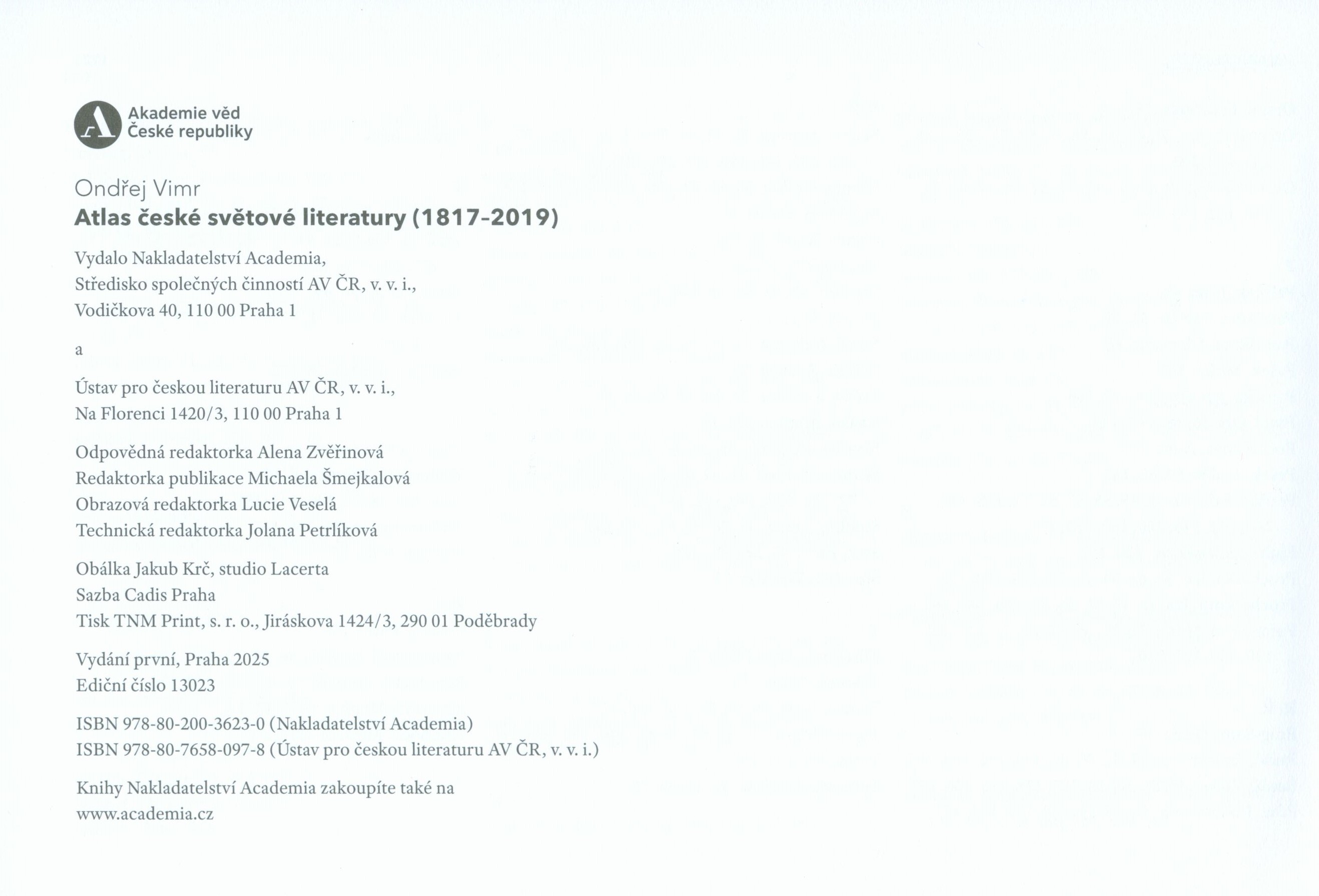 Title information Atlas české světové literatury (1817-2019) / Ondřej Vimr ; obálka Jakub Krč, studio Lacerta Personal name Vimr, Ondřej, 1978- (Author) (Author of introduction) Další autoři Krč, Jakub, 1973- (Bookjacket designer) Corporation Academia (nakladatelství) (Publisher) Ústav pro českou literaturu (Akademie věd ČR) (Publisher) TNM PRINT s. r. o. (tiskárna) (Printer) Edition statement Vydání první Publication Praha : Academia : Ústav pro českou literaturu AV ČR, v.v.i., 2025 Manufacture Poděbrady : TNM Print, s.r.o. Scope 223 stran : barevné ilustrace, mapy ; 17 x 25 cm ISBN 978-80-200-3623-0 (Academia ; vázáno) 978-80-7658-097-8 (Ústav pro českou literaturu AV ČR, v.v.i. ; vázáno) Country Czech Republic Language Czech Note Barevná vazba s mapkou, dvoubarevný text (i na hřbetu). - Nakladatelské značky. - Patitul. - Obsah. - Úvod. - Jednotlivé kapitoly. - Barevné grafy, mapky, tabulky. - Zkratky. - Databáze. - Anotace knihy a stručná biografie autora na zadní straně vazby.