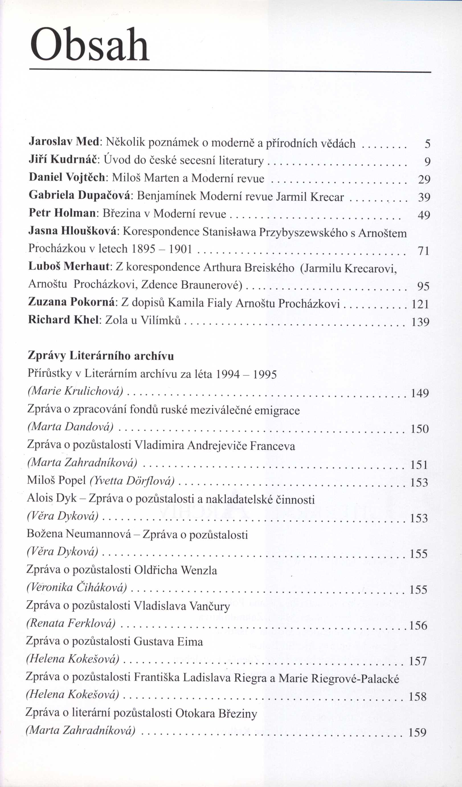 Title information Literární archív : sborník Památníku národního písemnictví = Annual of the Museum of the Czech Literature = Mémoires du Musée de la Littérature tchèque. Z času Moderní revue / odpovědná redaktorka Zuzana Pokorná ; grafická úprava Martin Balcar ; obálka a technická redakce Zdeněk Freisleben Další autoři Pokorná, Zuzana, 1962- (Publishing director) Balcar, Martin, 1957- (Book designer) Freisleben, Zdeněk, 1947- (Bookjacket designer) Corporation Památník národního písemnictví (muzeum literatury) (Publisher) Roč., číslo 28, 1997 Další var.názvy Z času Moderní revue Edition statement Vydání první Publication Praha : Památník národního písemnictví, 1997 Manufacture Hradec Králové : Progrestisk Scope 161 stran : ilustrace ; 24 cm ISBN 80-85085-25-9 (brožováno) Country Czech Republic Language Czech Note Černobílé portréty. - Anglická resumé. - 800 výtisků.