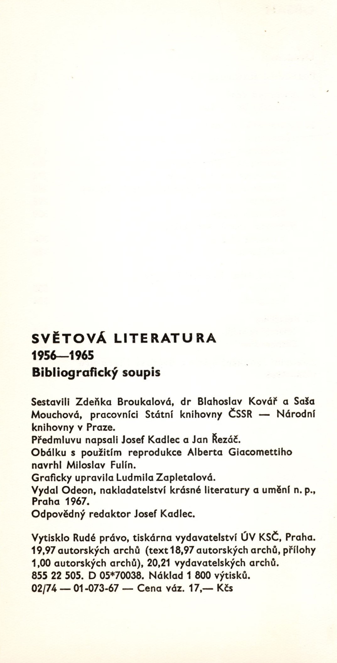 1. Title informationSvětová literatura 1956-1965 : Bibliografický soupis / Sestavili Zdeňka Broukalová, Blahoslav Kovář, Saša Mouchová ; Předmluvu napsali Josef Kadlec a Jan Řezáč ; Obálku s použitím reprodukce Alberta Giacomettiho navrhl Miloslav Fulín ; Graficky upravila Ludmila Zapletalová